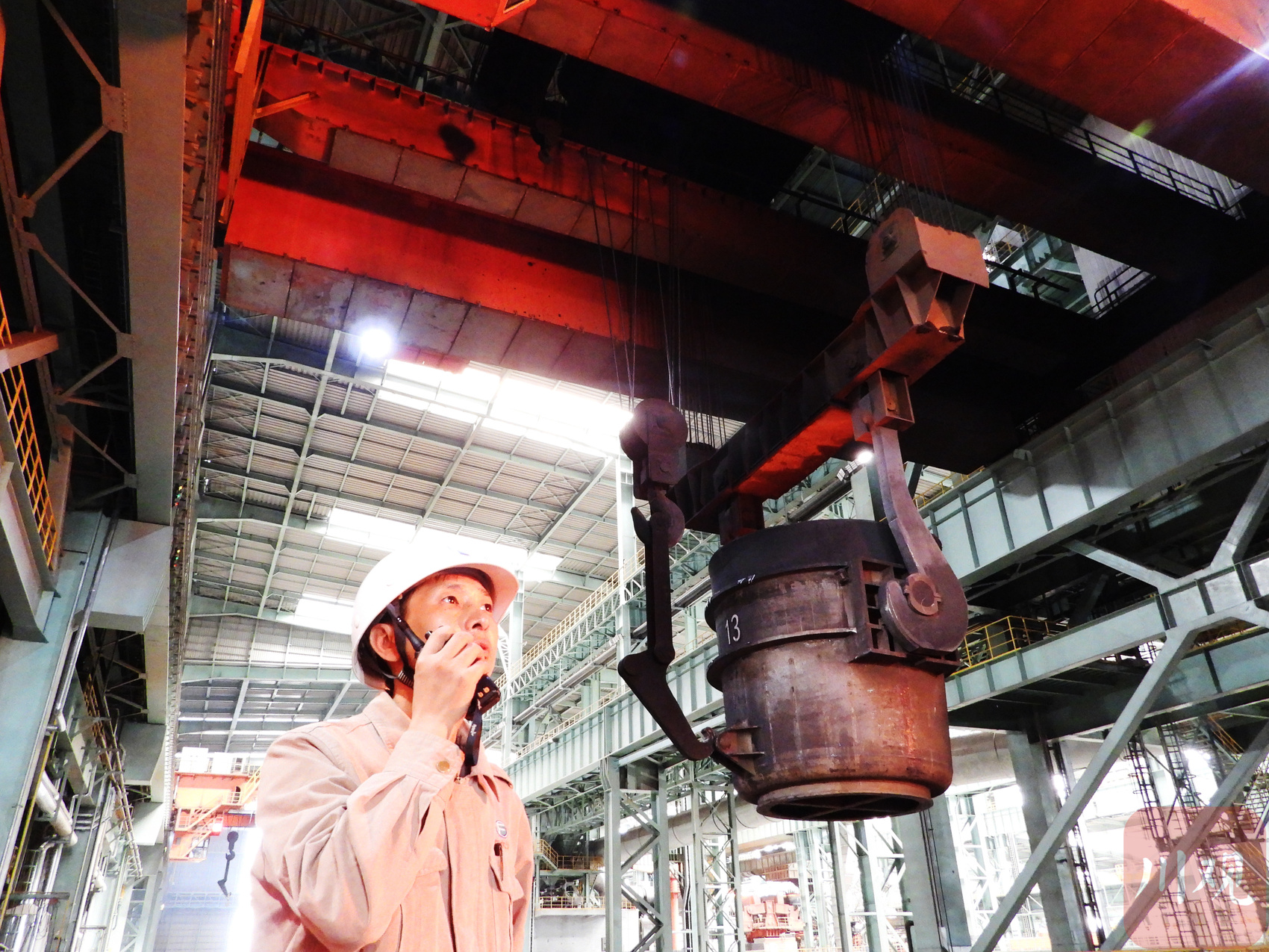 10月2日,在四川达州东部经开区麻柳镇的方大达州钢铁集团有限公司炼钢厂转炉车间,工人指挥龙门吊车吊运铁水。(C视觉签约摄影师/邓良奎