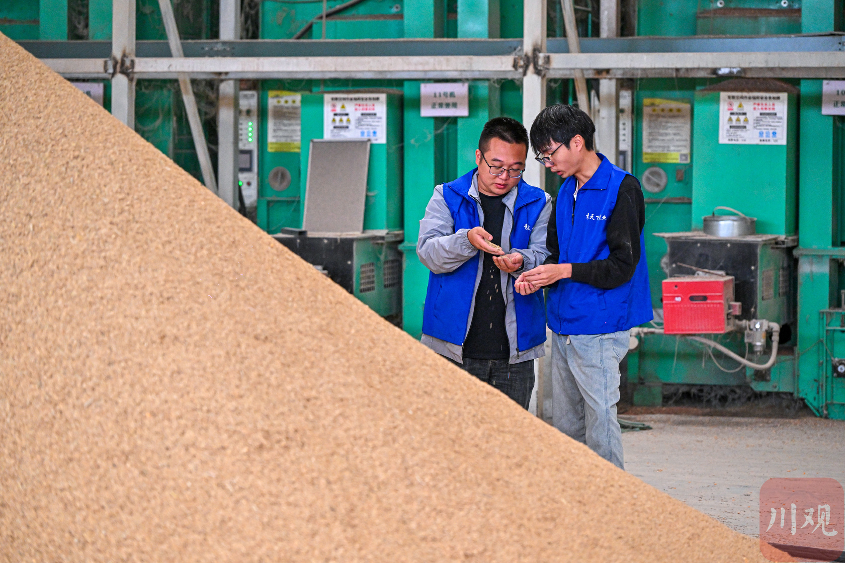10月1日,在眉山市仁寿县现代粮食园区的烘干中心,工作人员正在查看稻谷烘干情况。(C视觉签约摄影师/潘帅)