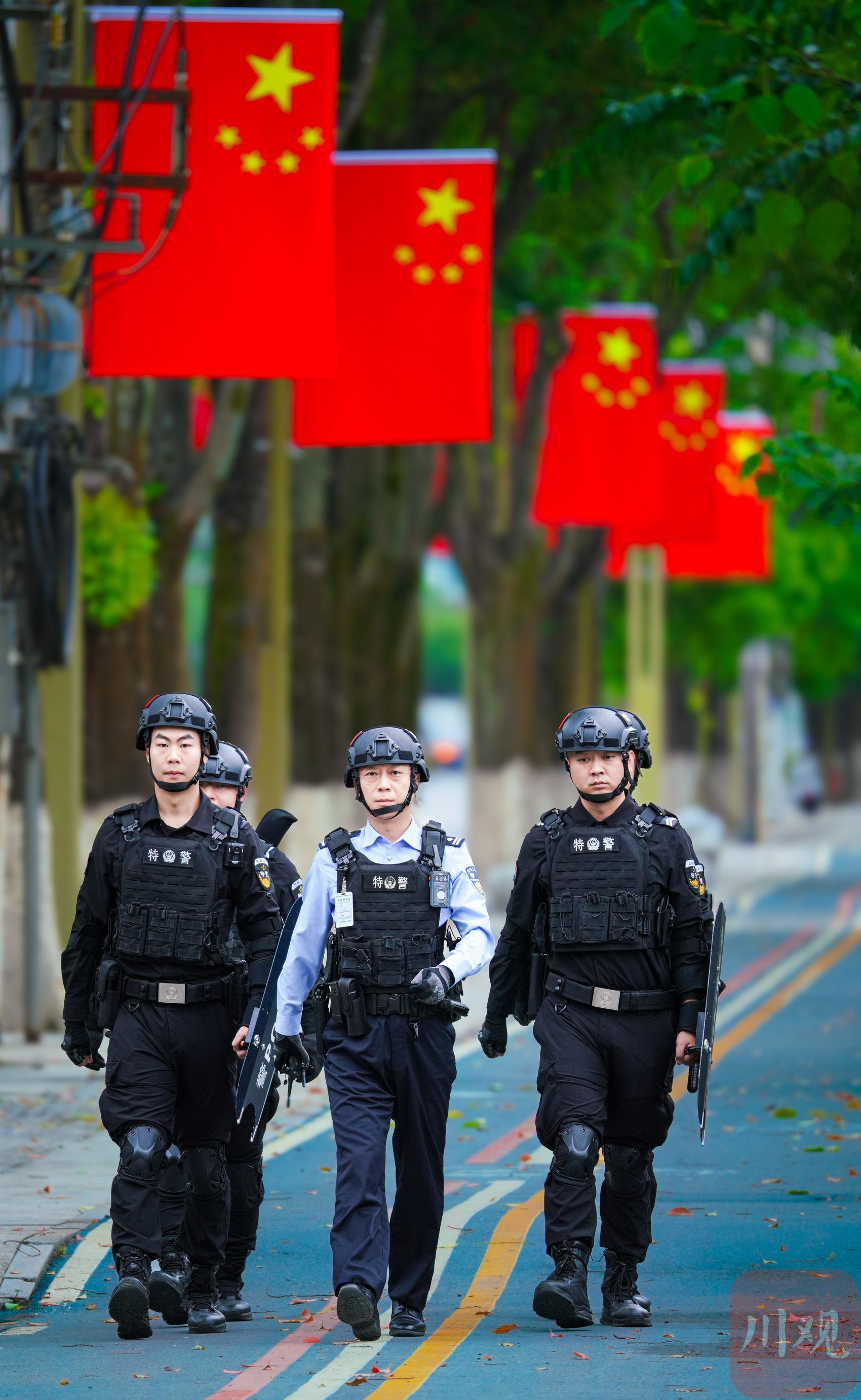 10月1日,达州市开江县普安镇工业园区,特警在街道开展巡逻。(C视觉签约摄影师/陈人华)