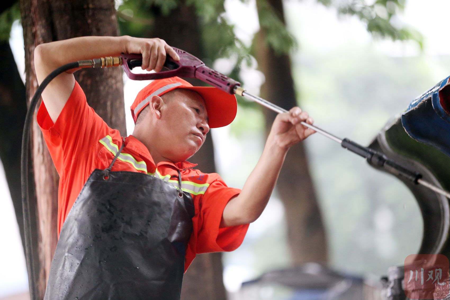 10月4日,乐山市市中区慧园街道,一名环卫工人手持高压水枪清洗垃圾桶。(C视觉签约摄影师/李华时)