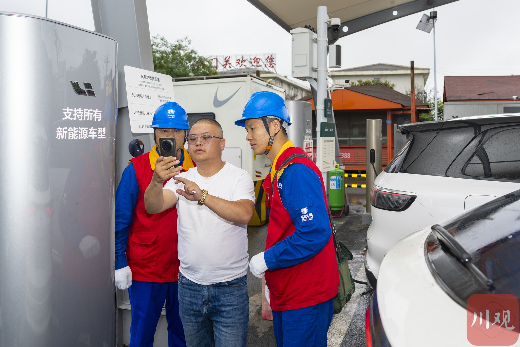 10月1日,京昆高速剑门服务区,国网四川广元供电公司员工指导客户使用 APP 为新能源车充电缴费。(C视觉签约摄影师/张超)