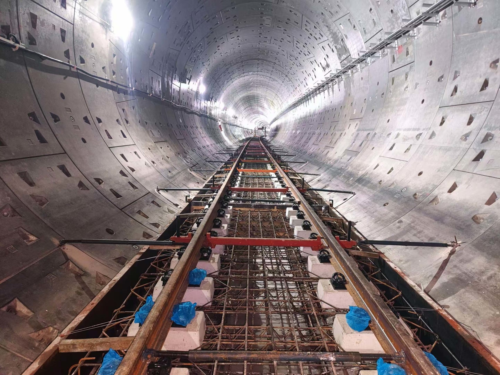 该区间内已完成1公里的轨道铺设,为后续机电、装修等工程奠定了基础。截至目前,成眉线全线9座车站主体结构封顶,全线盾构累计掘进进度占总量的93%,眉山段盾构区间全部洞通,铺轨及机电装修作业已陆续进场。