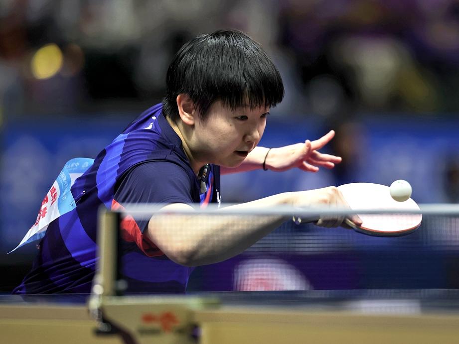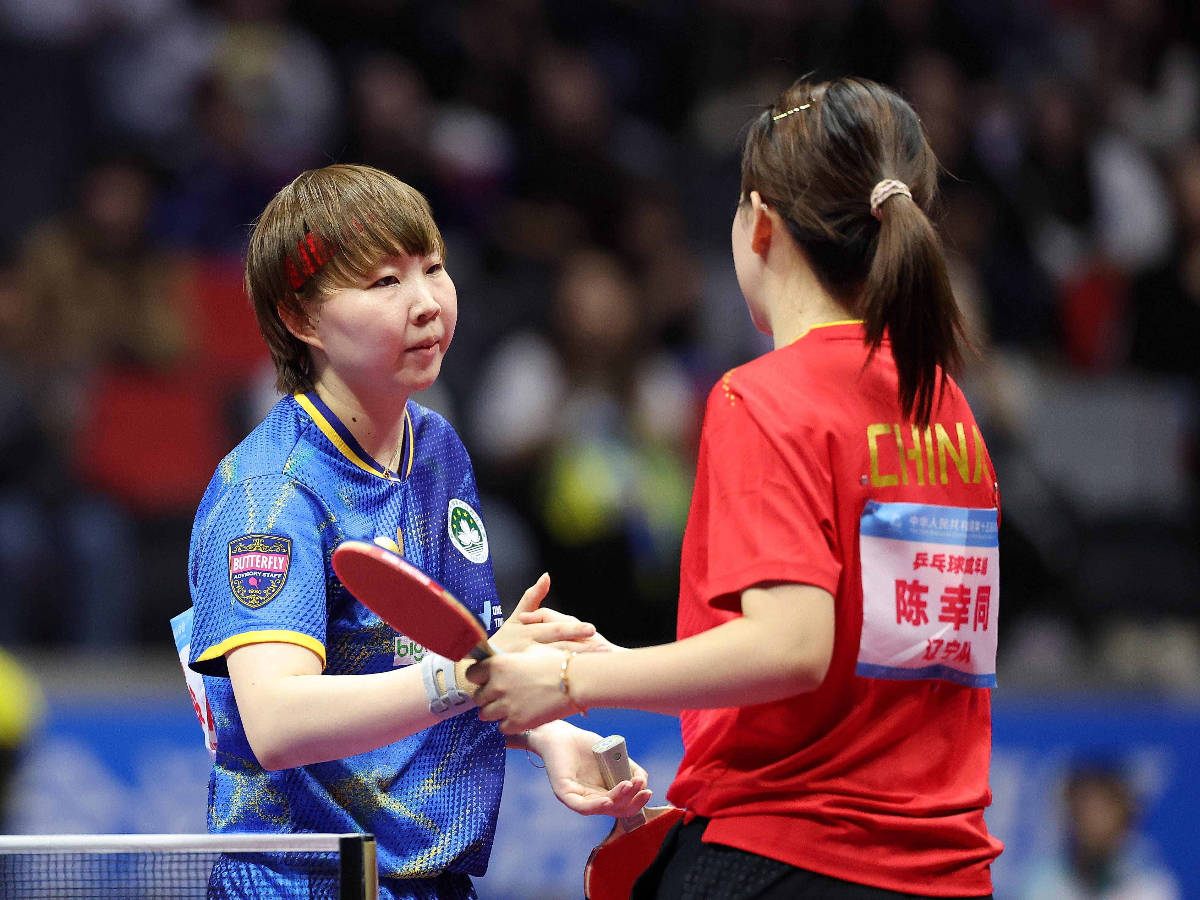 第六局,双方一上来继续展开激烈争夺,一路战至7比7平,关键时刻孙颖莎连得3分,10比7拿到赛点!陈幸同连续打出两个擦边球挽救两个赛点后,孙颖莎终于拿下致胜分,11比9,孙颖莎4比2战胜队友陈幸同,晋级决赛。
