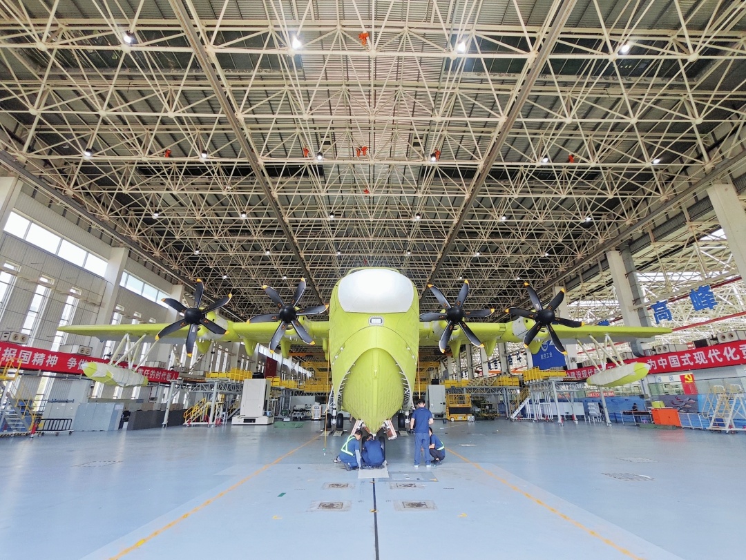 ▷中国航空工业集团消息,近日,我国大型民用水陆两栖飞机AG600“鲲龙”批产第三架机(1103架)总装下线并圆满完成生产试飞,批产第四架机(1105架)机头大部件交付中国航空工业集团通飞华南,标志着AG600项目实现了从型号适航取证向小批量生产的重要跨越。