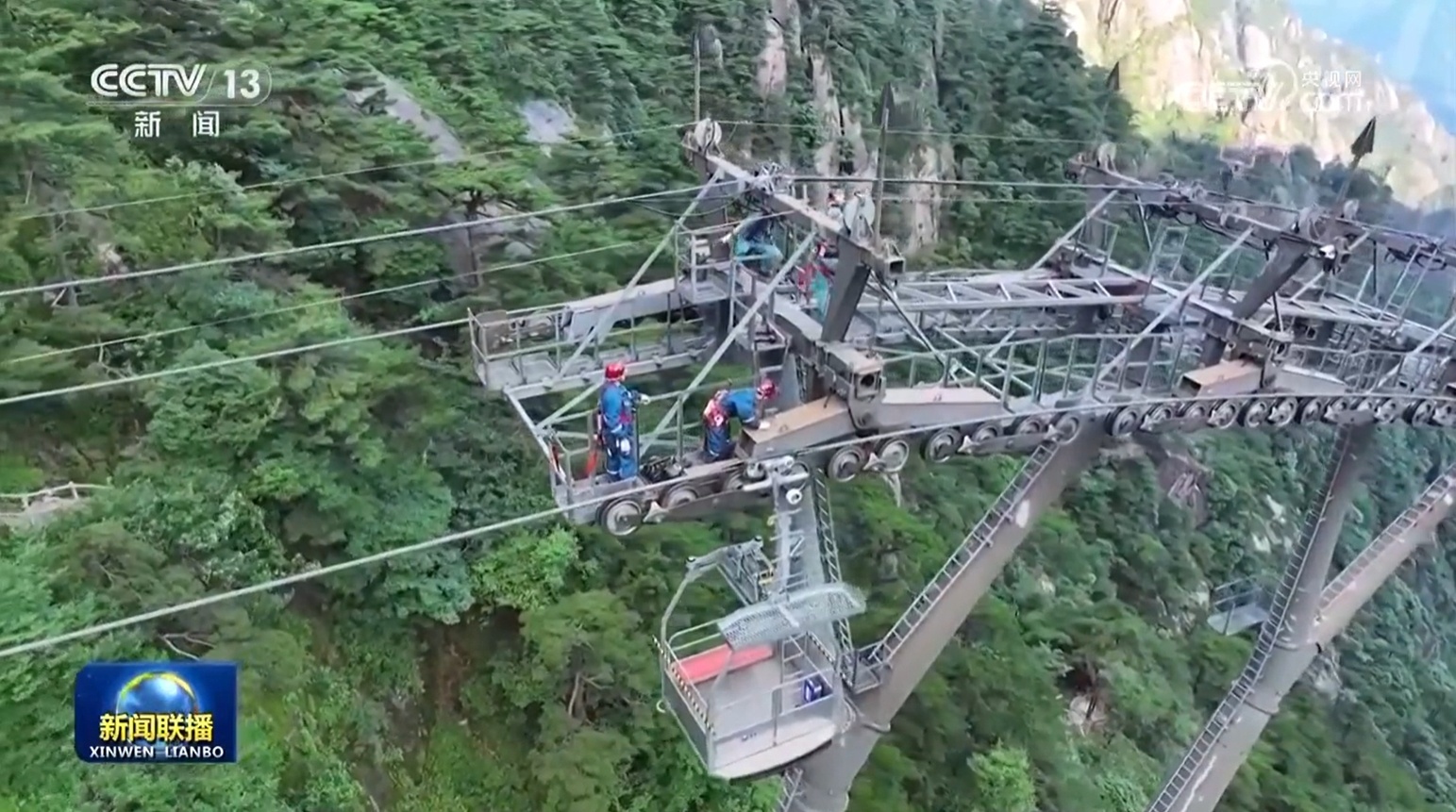 在黄山风景区,索道检修工不间断巡视云端索道,确保索道运行正常。环卫工人全员在岗,投入到各路段和悬崖外围保洁工作。