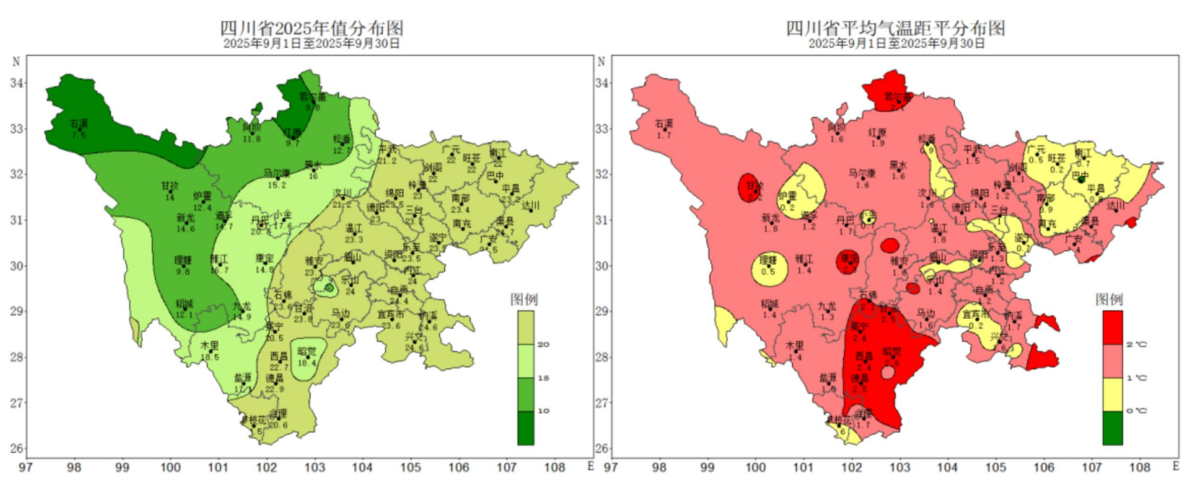 2025年9月四川省平均气温(左)及距平(右)分布图