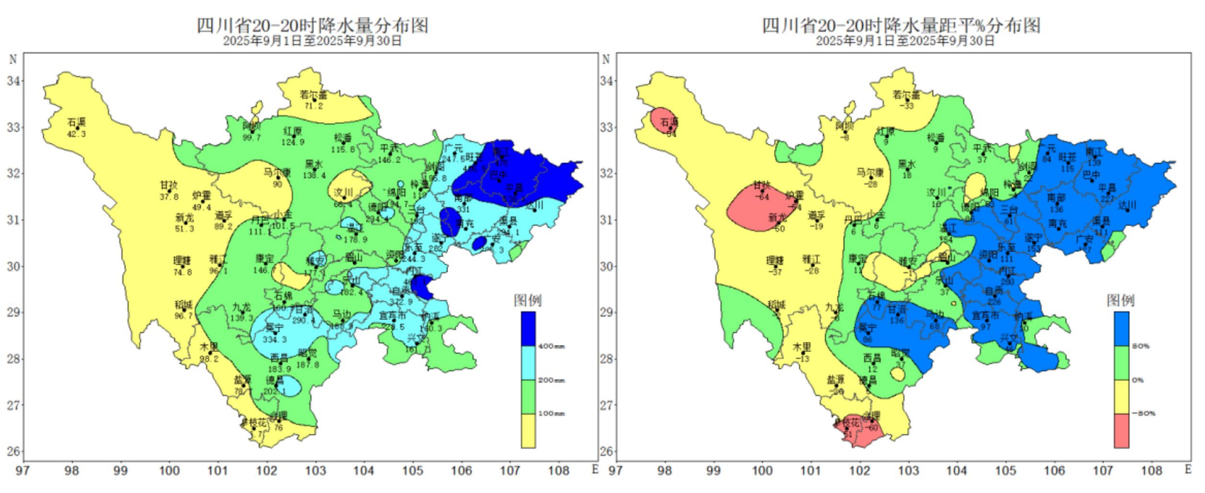 2025年9月四川省降水量(左)及距平百分率(右)分布图