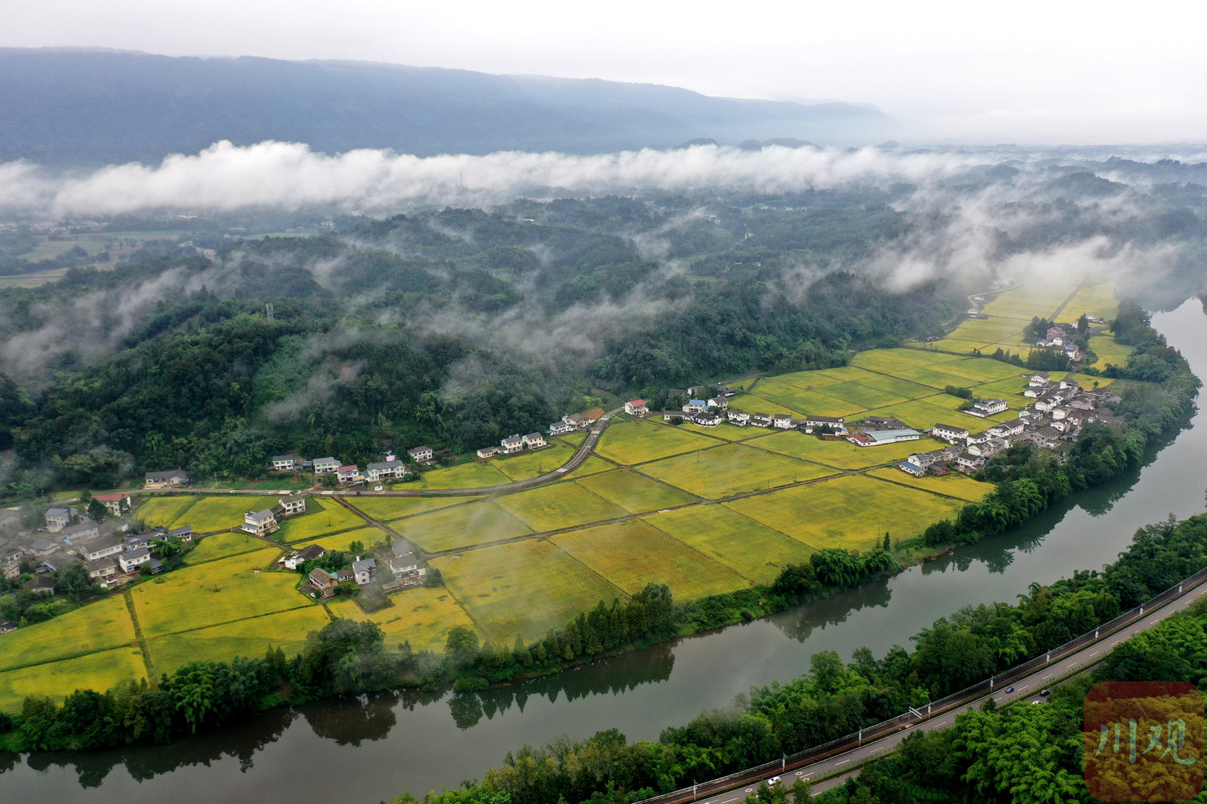 10月5日,眉山市洪雅县东岳镇桥口村,成熟的水稻与雨后的青山构成一幅山区乡村的美丽画卷。(C视觉签约摄影师 姚永亮 摄)