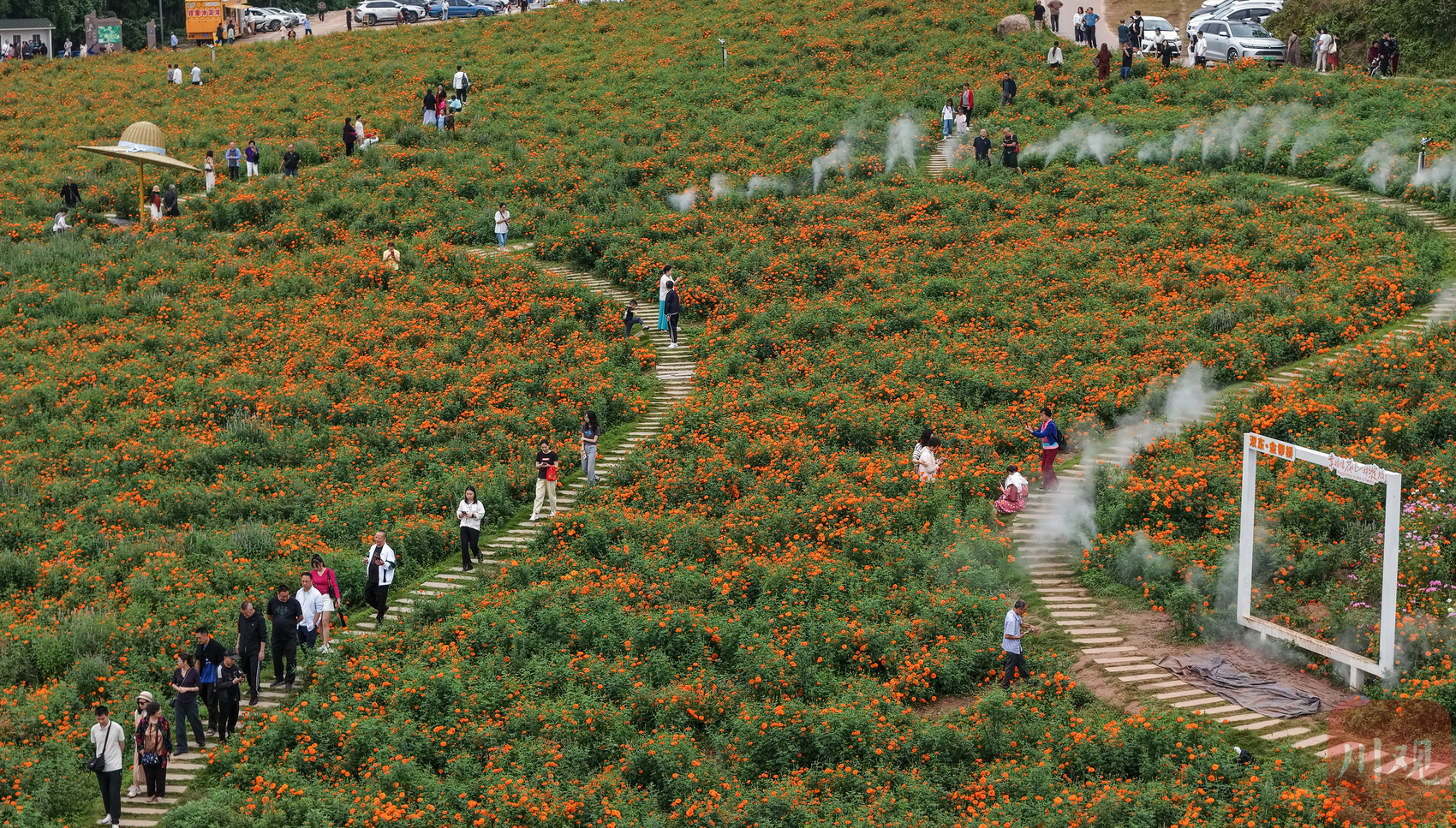10月5日,德阳市旌阳区双东镇金锣桥村产业园种植的220多亩金锣鸣菊竞相开放,吸引游客来此打卡、游玩,体验乡村生态特色文化。(C视觉签约摄影师 王福明 摄)