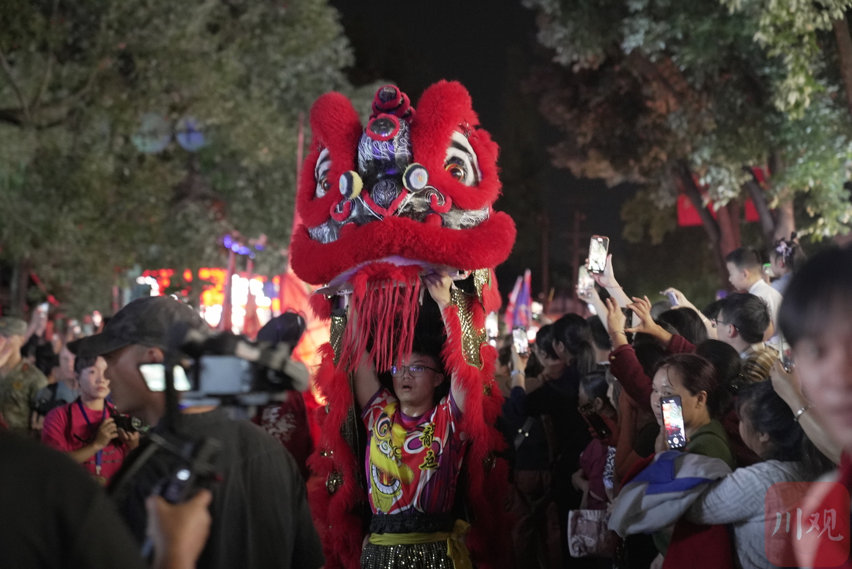 喜庆的醒狮在龙灯巡游队伍的最前端,一边表演一边与沿途观众游客互动。