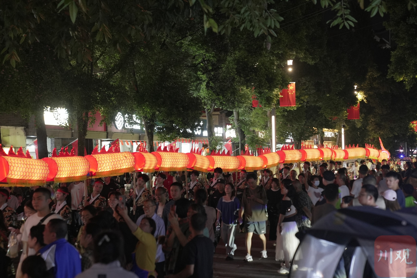 10月5日晚,青白江城厢古城绣川广场华灯初上。一支特色鲜明、阵容齐全的汉服龙灯队,正牵引着重达80余斤的榫卯板凳龙舞动,百米“巨龙”在千年古城上空灵动腾跃,引得现场市民、游客阵阵欢呼。