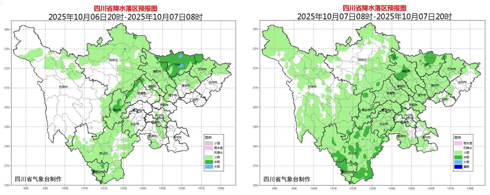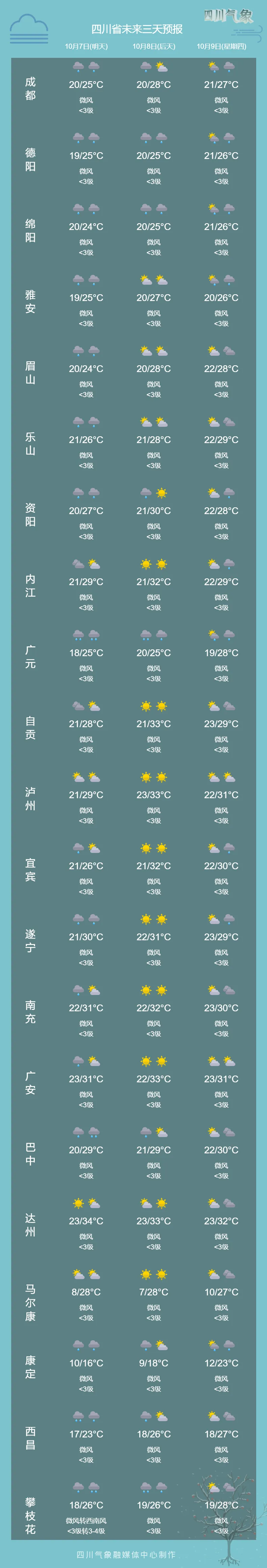 顺便说一下,四川省气象台最新天气预报显示,今天晚上,盆地西部北部部分地方有阵雨或小雨,局部有中雨,个别地方大雨;川西高原北部东部有分散阵雨或雷雨;攀西地区阴天有阵雨。明天白天,盆地大部地方有阵雨或小雨,西部的局部有中雨;川西高原多云间阴有分散阵雨或雷雨;攀西地区阴天有阵雨,局部有中雨。