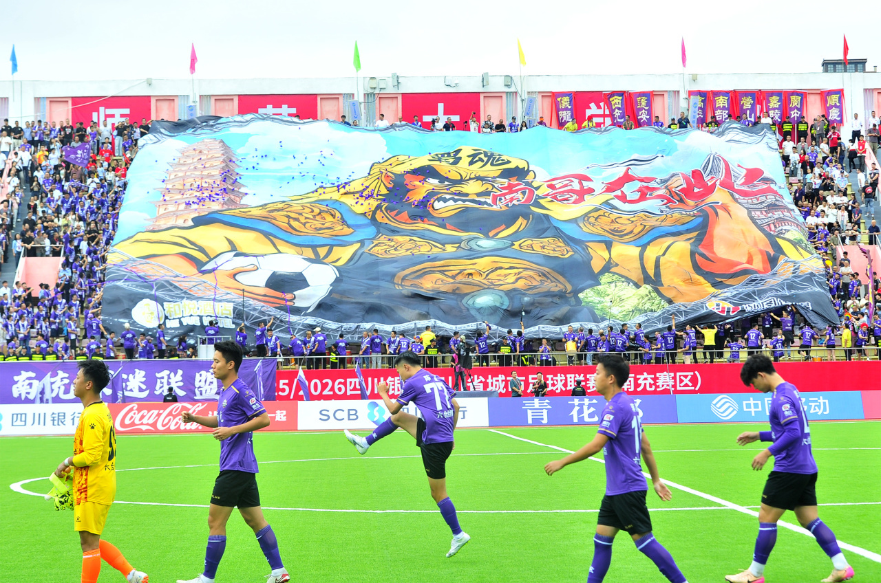 10月2日,南充丝绸源点队主场对阵广安板楯蛮队。南充队凭借9号鲜小龙的一粒点球,最终以1:0的比分战胜广安队。图为比赛开始前,南充球迷打出巨型布画,为南充队助威。