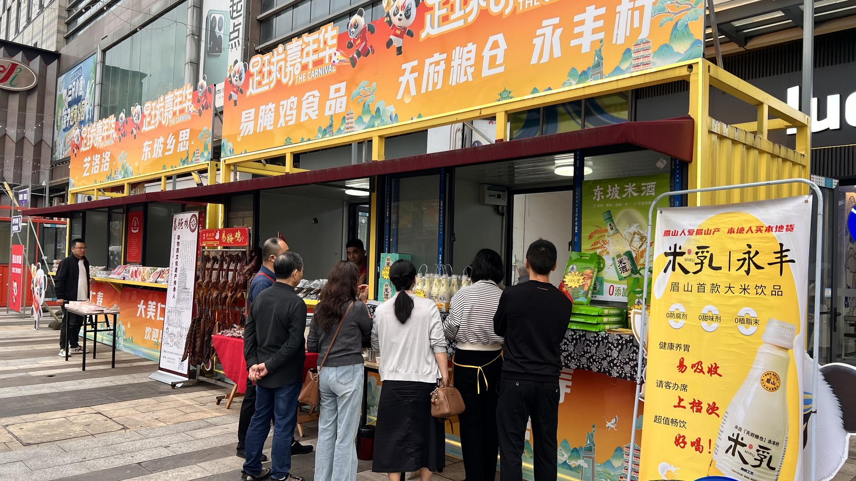 在眉山市仁寿县体育场外,永丰村米乳、特色腌鸡等本地美食亮相,吸引游客驻足品尝。(谭笑非 摄)