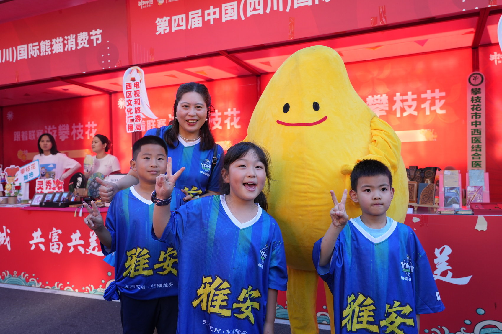 攀枝花赛场外,球迷小朋友与攀果玩偶合影留念。(湛璐霜 摄)