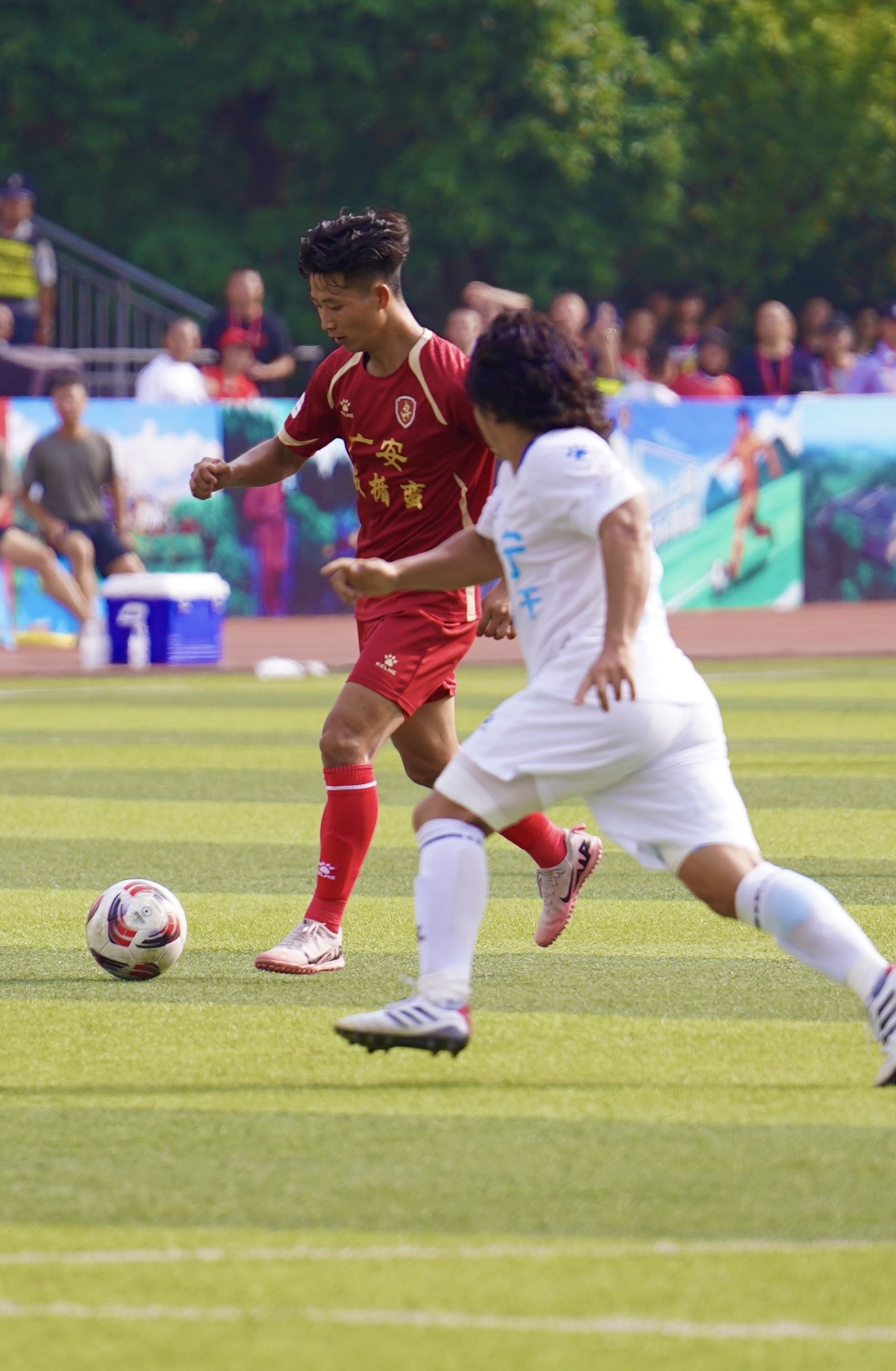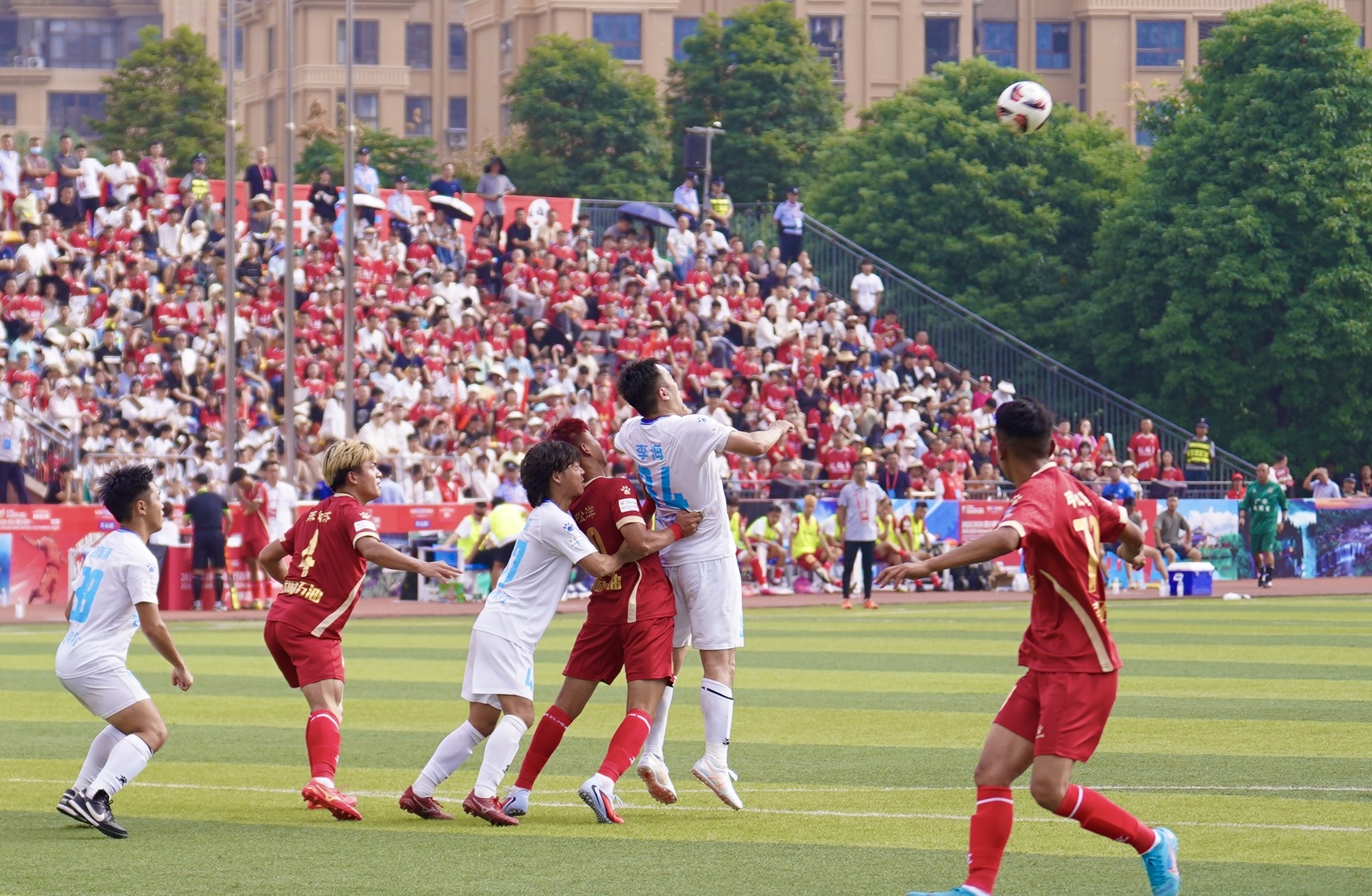 “拿下3分!拿下3分!”随着裁判员哨声响起,广安板楯蛮队8号队员谭严杰在角球区抬脚抽射,足球精准飞至球门上空。在全场球迷注视下,广安4号队员陈俊杰迅速起跳,头球破门。