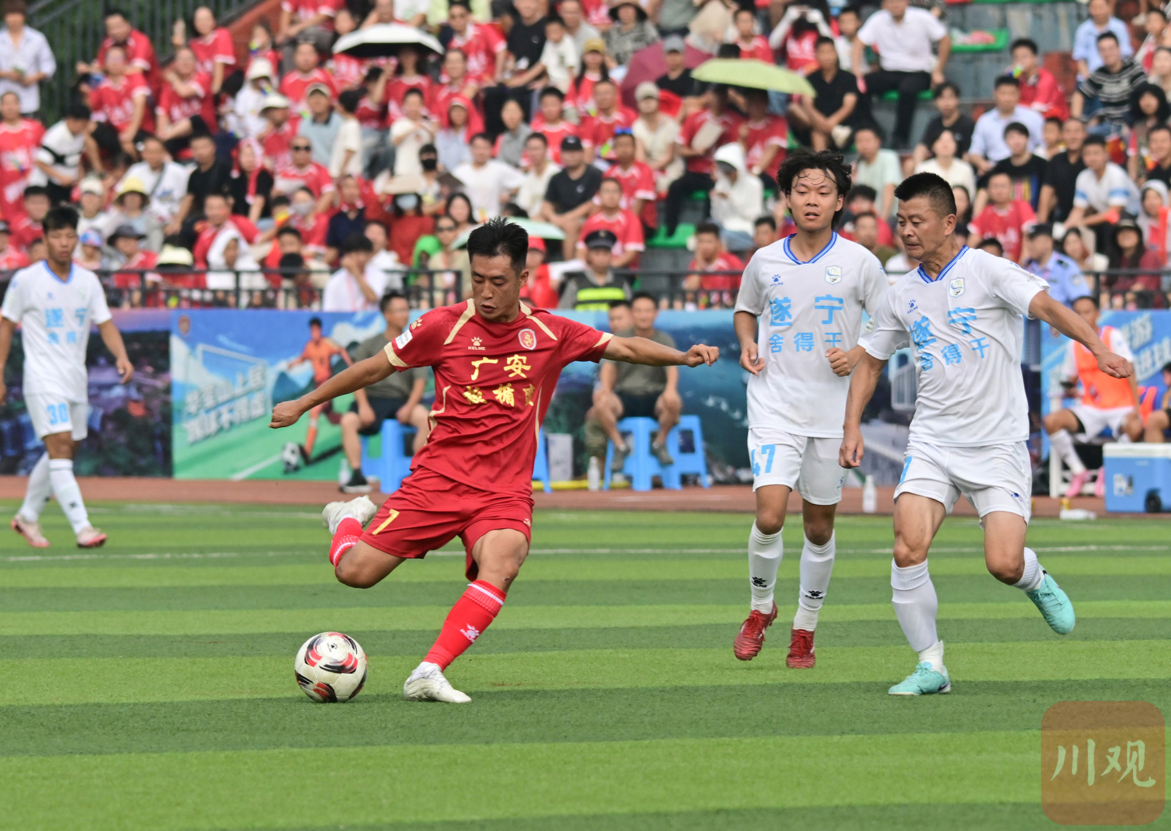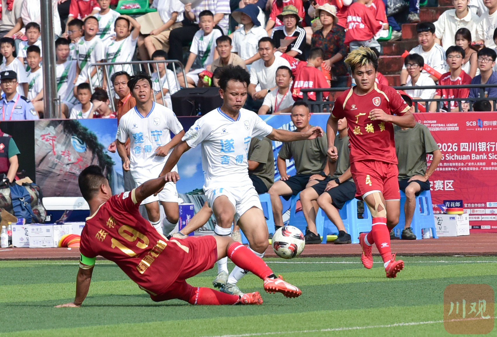 2025年10月6日,广安板楯蛮队与遂宁舍得干队双方队员在“川超”比赛中激烈拼搏。(C视觉签约摄影师 张国盛 摄)