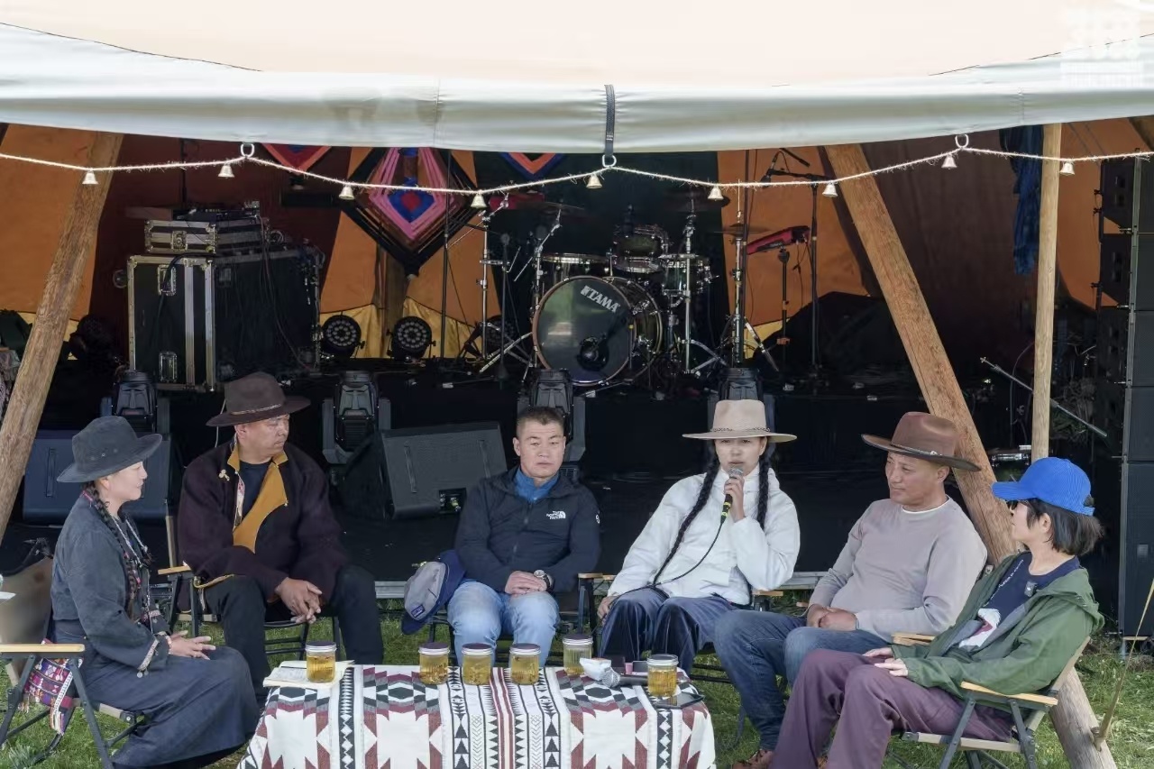 吴珍(右三)在塔公甘孜州山地文化旅游节暨318生活季思想雪线沙龙现场,和来自全球的游牧者、创意人与探索者共同探讨文旅话题。受访者供图