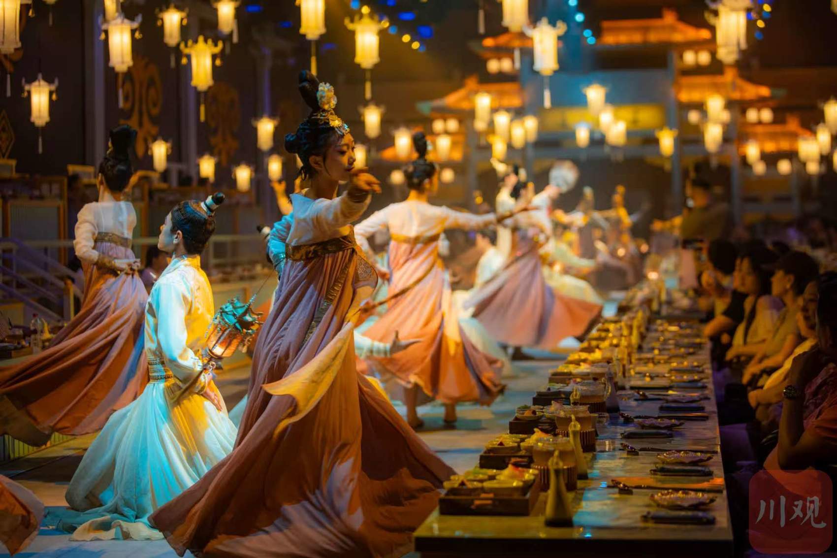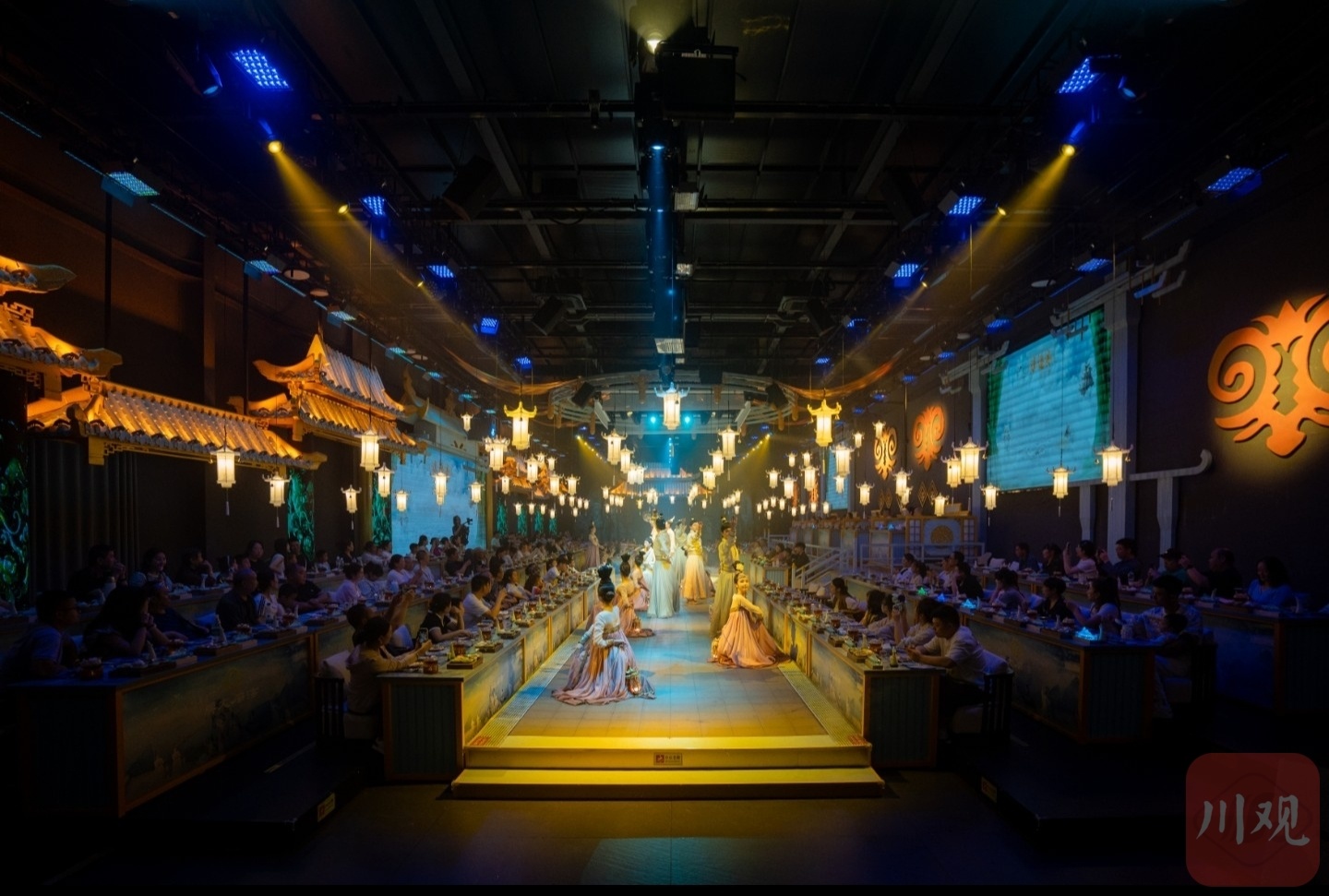 推开一扇门,时空骤然流转;国风乐声如水漫溢,遮面侍女罗袖轻扬,将宾客引入流光溢彩的“宫殿”深处……在这里,现代食客化身古代“才子佳人”,欣赏逍遥仙舞,品尝地道的苗乡美食。“太新奇了!身临其境般‘穿越’到了宫廷盛宴现场!”专程冲着兴文石海景区溶洞餐秀而来的重庆游客何佳佳,在体验后难掩兴奋。