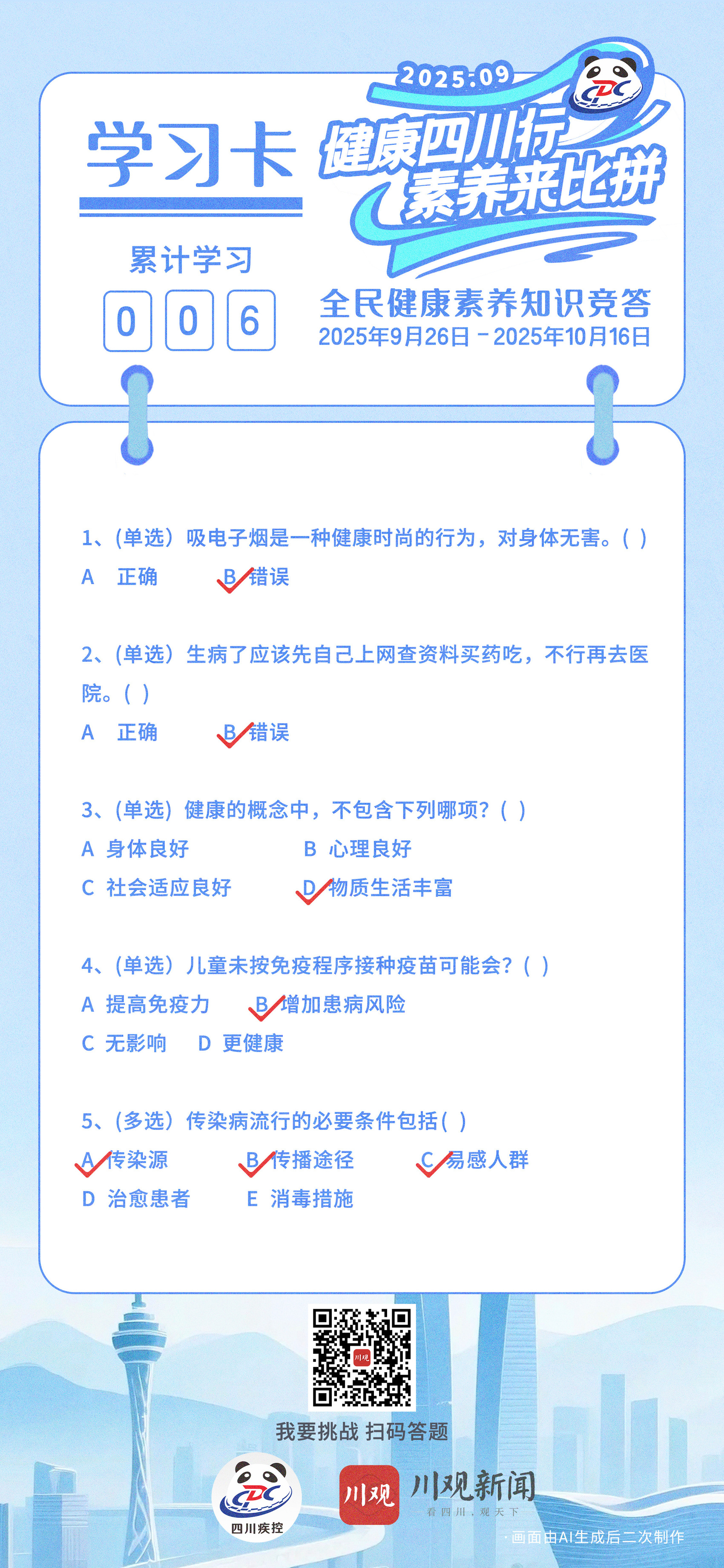 “健康四川行・素养来比拼——全民健康素养知识竞答”活动火热进行中,此次活动从9月26日开启,将持续至10月16日。活动启动以来,全省民众的参与热情一路攀升,踊跃投身知识竞答。10月8日,新的学习卡上线,为选手冲击更高分数提供助力。