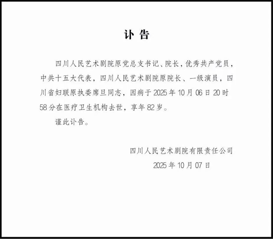 10月7日晚,四川人民艺术剧院有限责任公司发布讣告。10月6日,四川人民艺术剧院原院长、一级演员席旦同志突发疾病抢救无效去世,享年82岁。