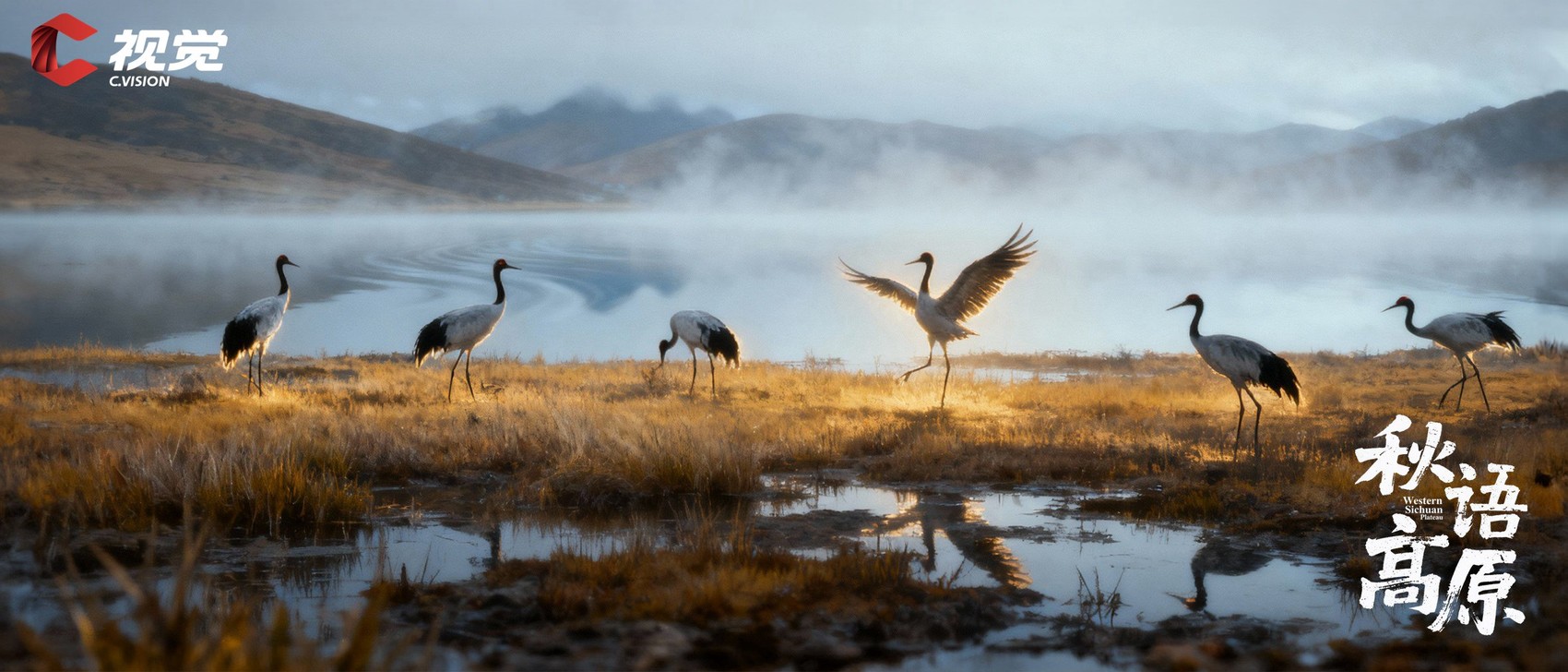 高原湖畔晨雾绕,群鹤或立、或寻食、或振翅,缀在金黄草甸与澄澈水光间。