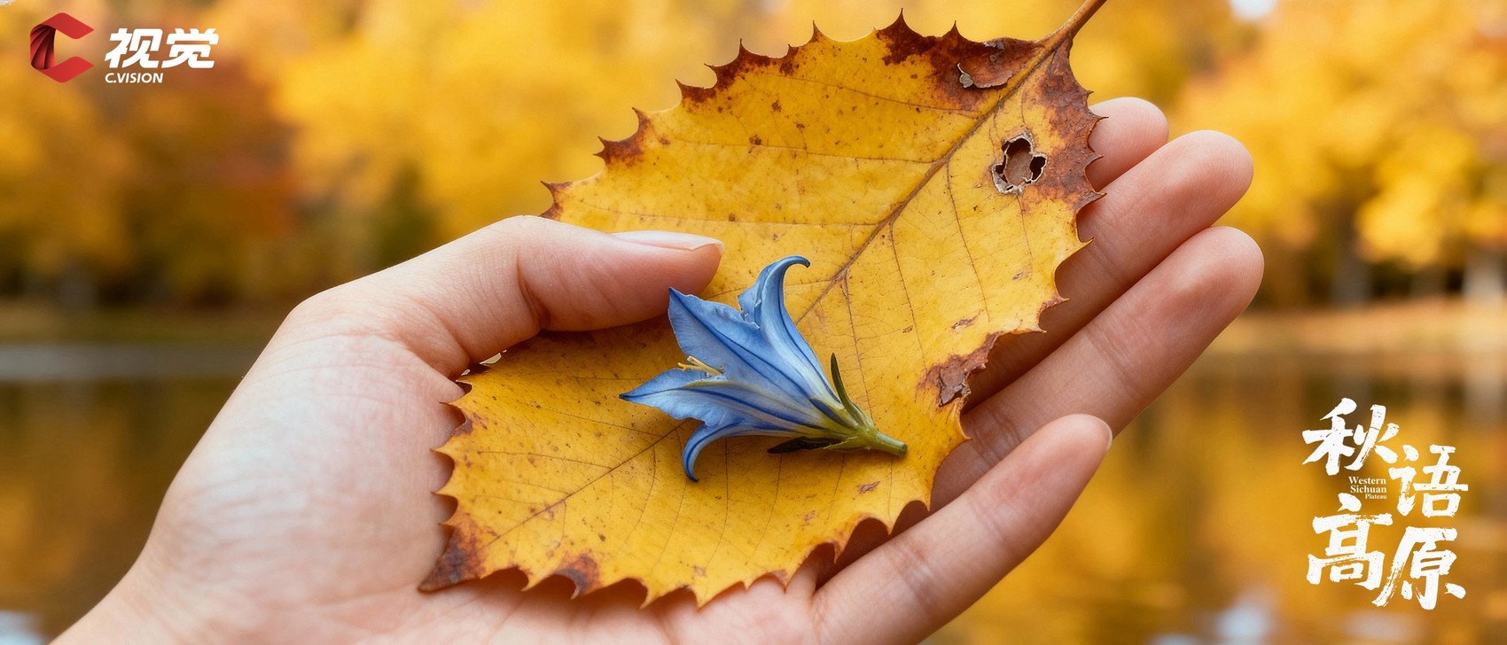 手捧金黄秋叶,叶上卧着蓝花,在高原秋景的暖黄里,藏住秋的细腻温柔。