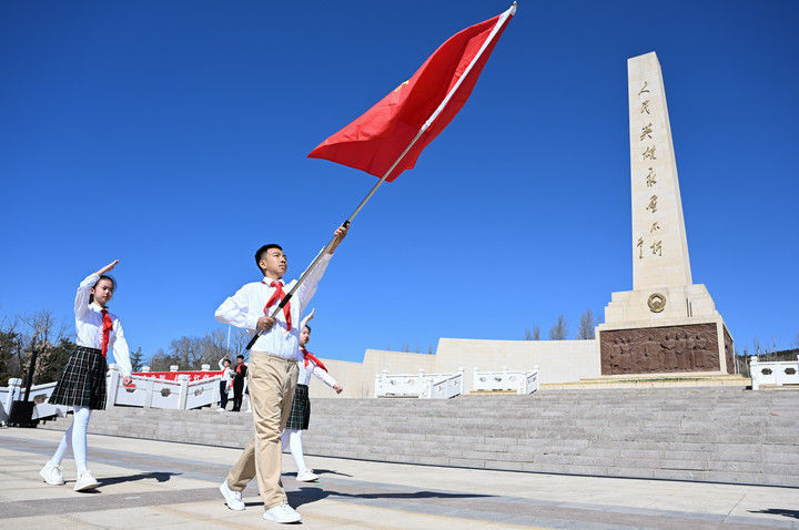 这是2025年4月2日在内蒙古呼和浩特市大青山红色文化公园拍摄的中国少年先锋队出旗仪式。