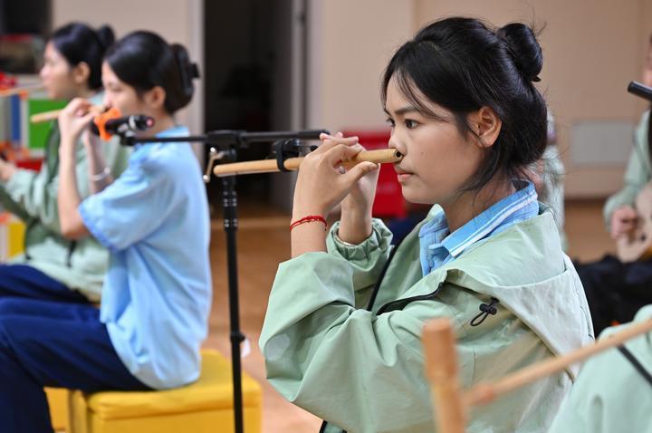 2025年6月12日,海南省民族技工学校学生在练习黎族鼻箫。近年来,海南省五指山市打造“非遗进校园”工程,在14所公办中小学开设非遗课程,培养青少年对中华优秀传统文化的热爱,助力非遗传承与发展。