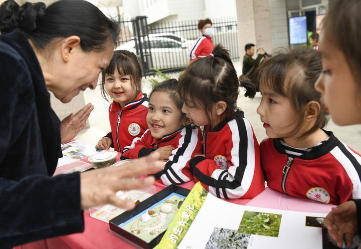 2024年4月16日,在新疆乌鲁木齐市天山区南湾街街道,昌乐园幼儿园的小朋友在老师的讲解下了解春蚕的生长过程。谷雨节气将至,乌鲁木齐市一些社区纷纷开展形式多样的主题活动,让市民了解有关谷雨节气的知识,体验传统文化的魅力。