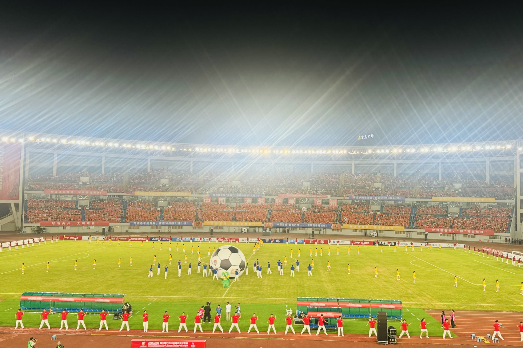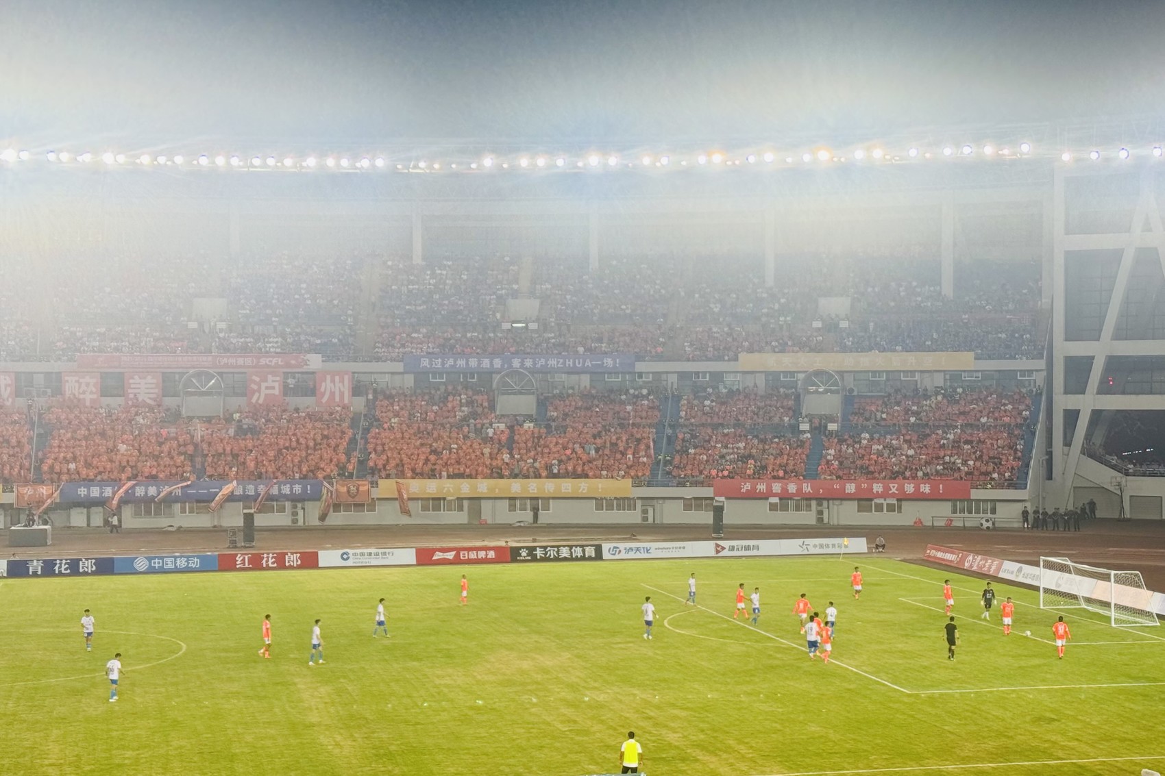 “有盐同咸 无酒不欢 酒城盐都 共享烟火人间”10月8日晚19时52分,在泸州市奥林匹克体育公园现场,欢呼呐喊声此起彼伏,伴随全场观赛人员同念标语的响声中,泸州窖香队与自贡灯城燊龙队双方队员依序入场。两队于20:00,准点开“zhua ”。