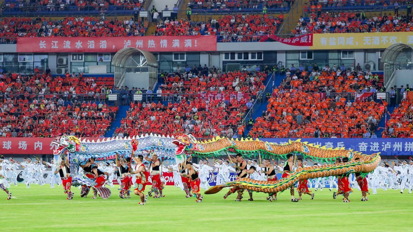 泸州赛场内,歌曲《四渡赤水出奇兵》将人们拉回峥嵘岁月;泸州数字城市宣传官“酣酣”用一脚远传带球迷们穿越了太平渡口、国宝窖池、张坝桂圆林、白塔等泸州特色地标;雨坛彩龙、百和莲枪舞等表演精彩连连……
