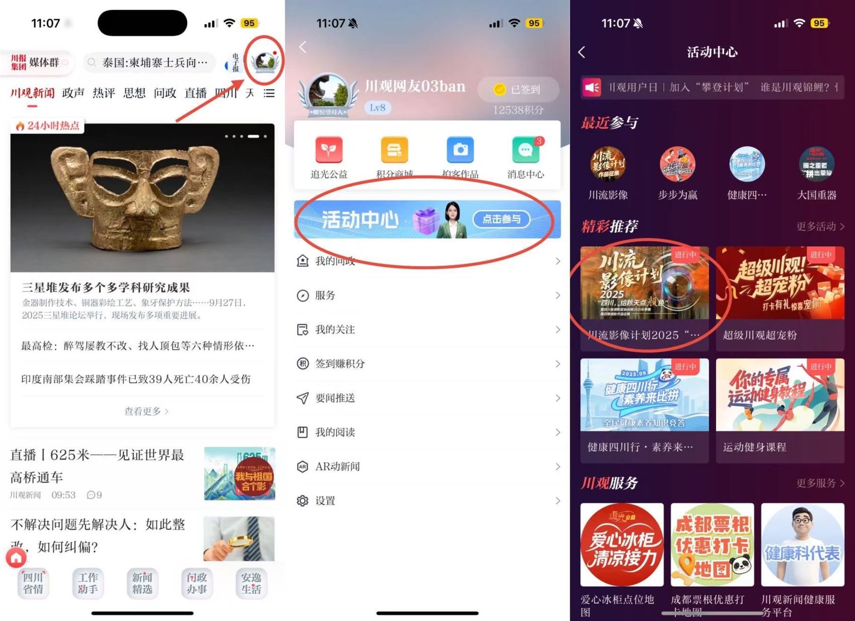 方式二:在川观新闻首页,点击右上角“我的”,再点击“活动中心”,找到“川流影像”投稿通道图片,点击即可参与投稿;