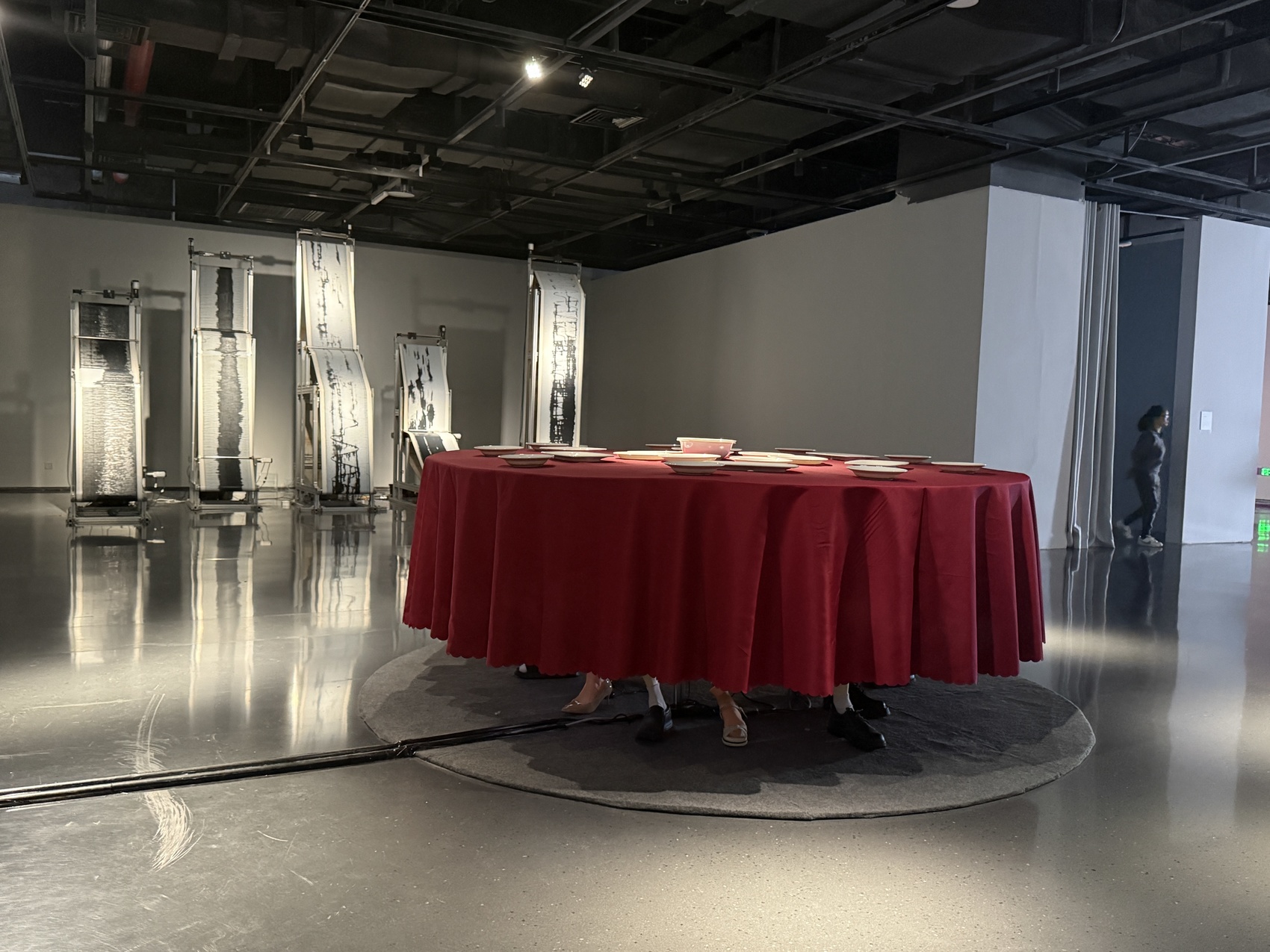 走进展厅,一件件作品充满艺术巧思与科技感。电子科技大学学子创作的作品《壳》,用钢与尼龙构建机械海浪,通过无生命装置对自然形态的模拟,叩问人类制品与生态的共生边界;四川美术学院研究生的作品《第一因》则通过传感装置与光影叙事,抛出“人类塑造技术还是技术重塑人类”的深刻追问。同时,联展中也有两校学子共同合作共创的作品。一件名为《团圆》的作品主体为一张随观者聚散而倾斜的互动桌面,通过物理的失衡与文字的流变,既隐喻着宴席中微妙的情感张力,亦呼应着个体在不同生命阶段对“团圆”这一仪式的复杂感知;另一件作品《络》以生命律动与机械造景之间的联络为精神内核,用塑料软管中脉动的水流模拟“生命脉络”。
