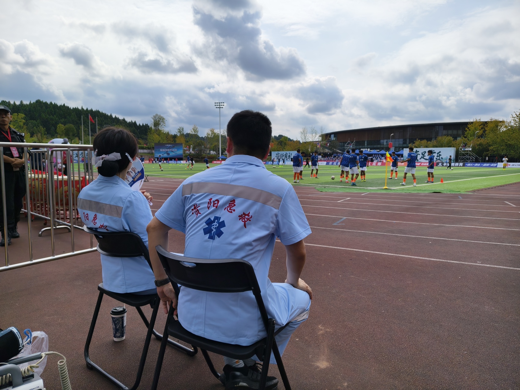 10月3日,“川超”资阳赛区,医务人员在赛场进行医疗保障(白华宇摄)