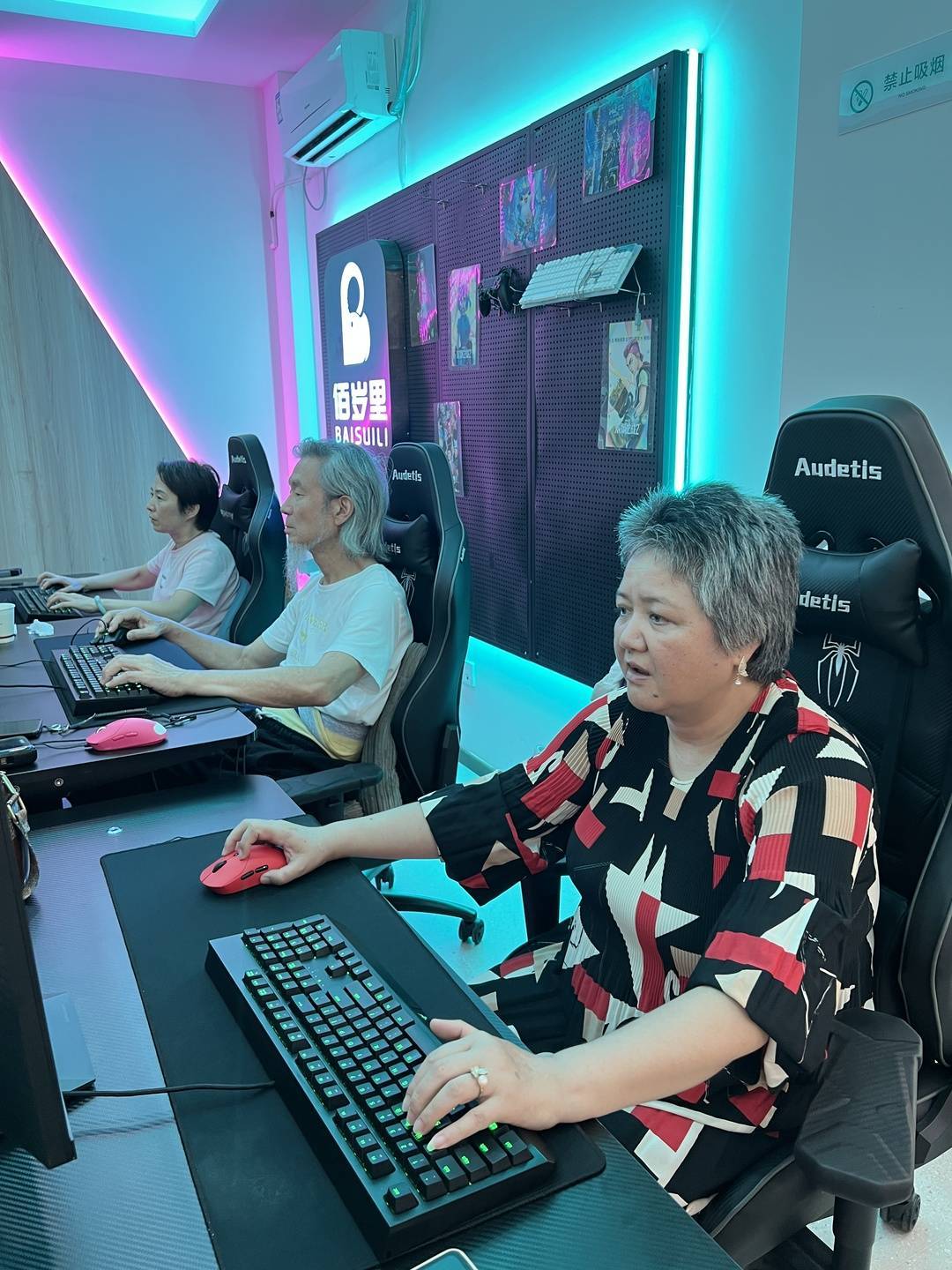 在多数人的传统认知里,头发花白的银发族与氛围紧绷、光影交错的电竞室天然不适配,打太极、下象棋等慢节奏项目,似乎才是中老年的舒适区。然而,这家电竞室组建的“BSG”银发电竞队,正在打破这种刻板印象。战队创办人、四川佰岁里养老服务有限公司总经理杜放介绍,“BSG”意为“百岁Game”,战队于2024年11月成立,2025年3月完成7人团队组建,队员平均年龄65岁,主玩游戏为《英雄联盟》。“因为爷爷奶奶、叔叔阿姨都有点3D眩晕症,所以最后选择了《英雄联盟》。”杜放表示。