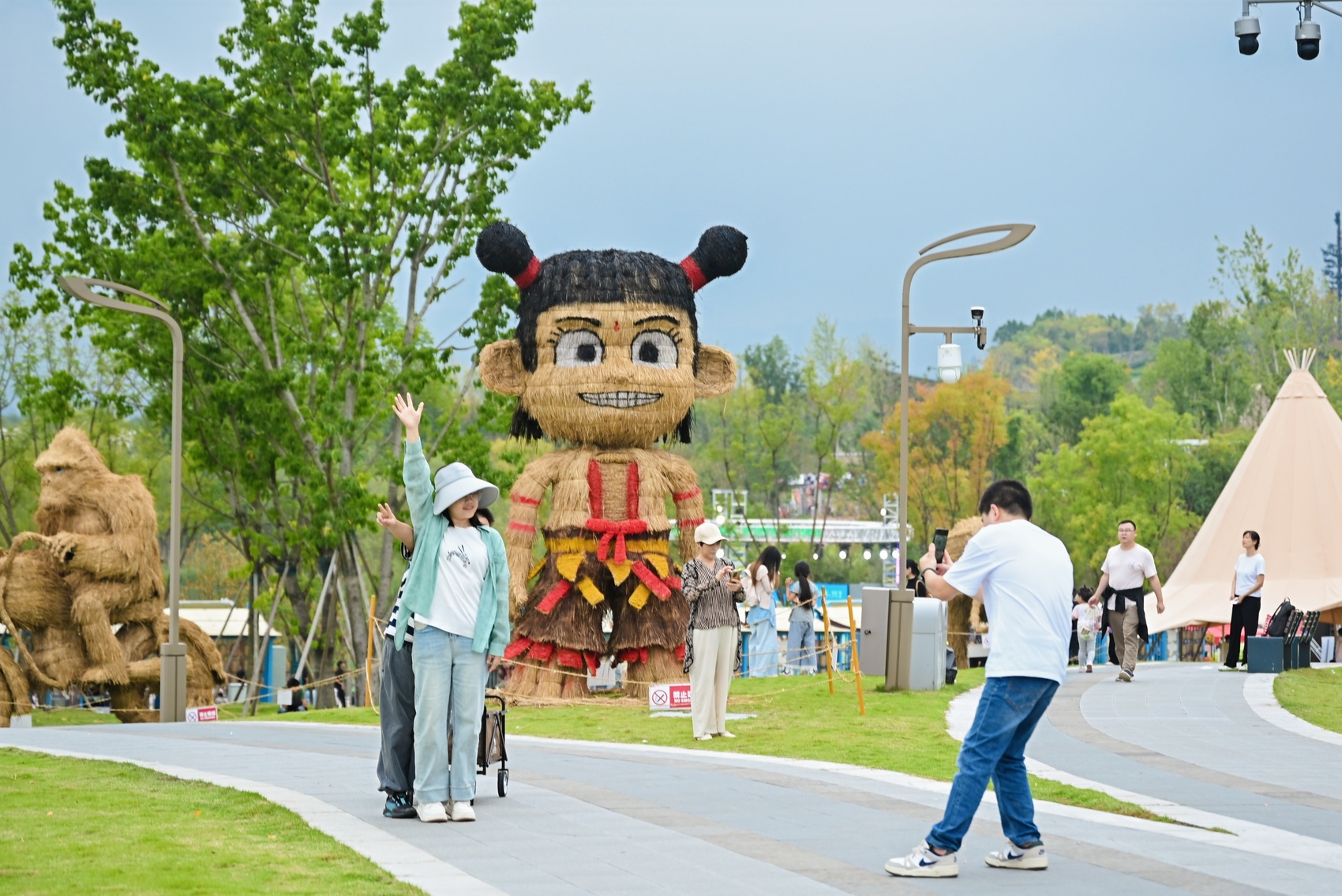 在成都世博园,全国最大规模的“稻草人艺术节” 成流量担当:6大主题、50余组巨型稻草人装置,成为亲子家庭拍照打卡地;绛溪河景观、摩天轮草坪同步推出特色活动,将世园会遗产转化为公共旅游资源。“孩子看到稻草恐龙就挪不动步,幸好提前订了附近酒店,逛完世博园还能去三岔湖。” 重庆游客李女士说。