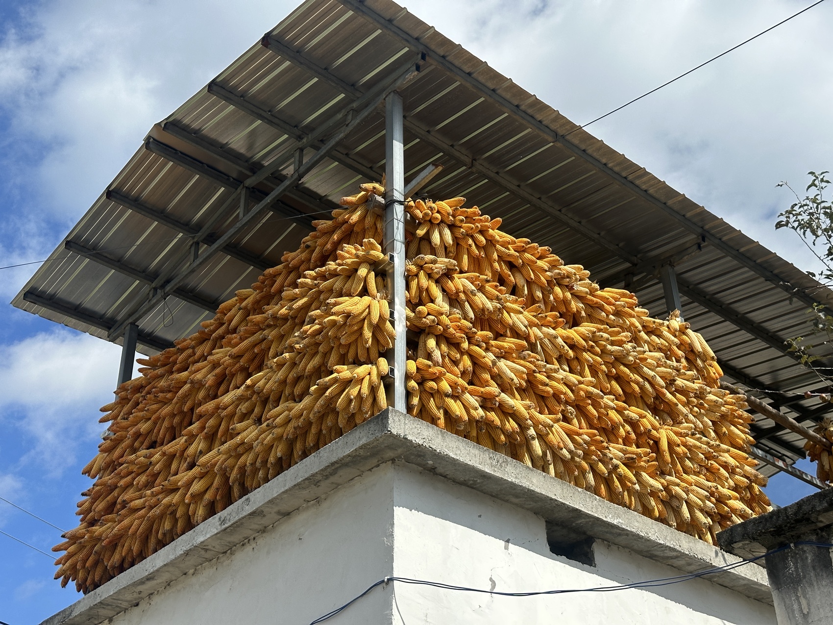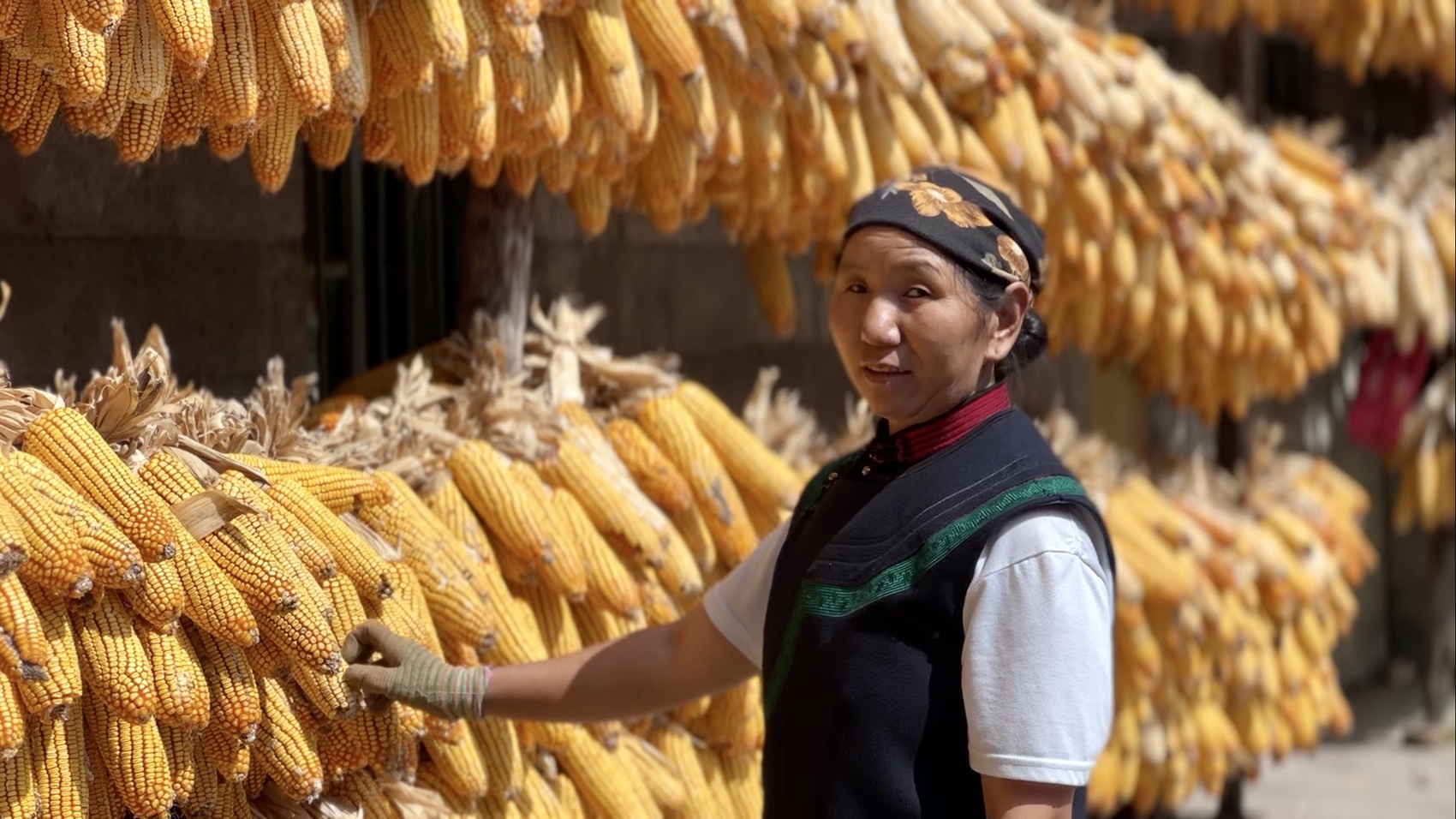 哈木村房前屋后挂满正在晾晒的玉米果实。