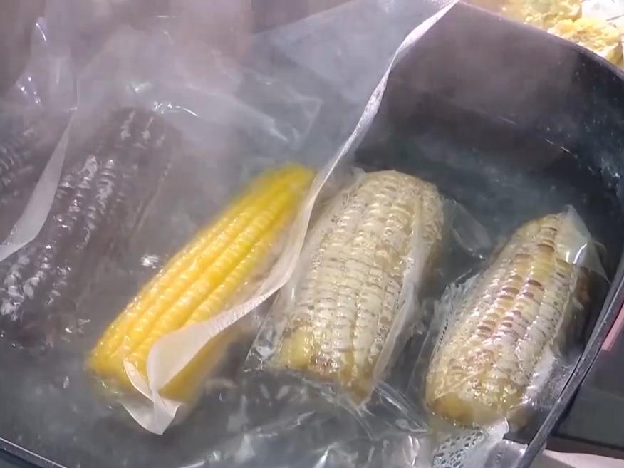 合作社务工人员采摘玉米并向记者展示丰收成果。