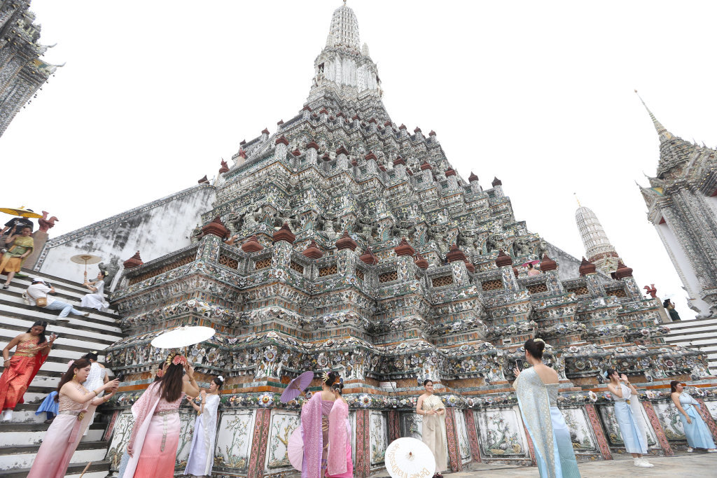 10月9日,游客身穿泰服在泰国曼谷郑王庙景区拍照。