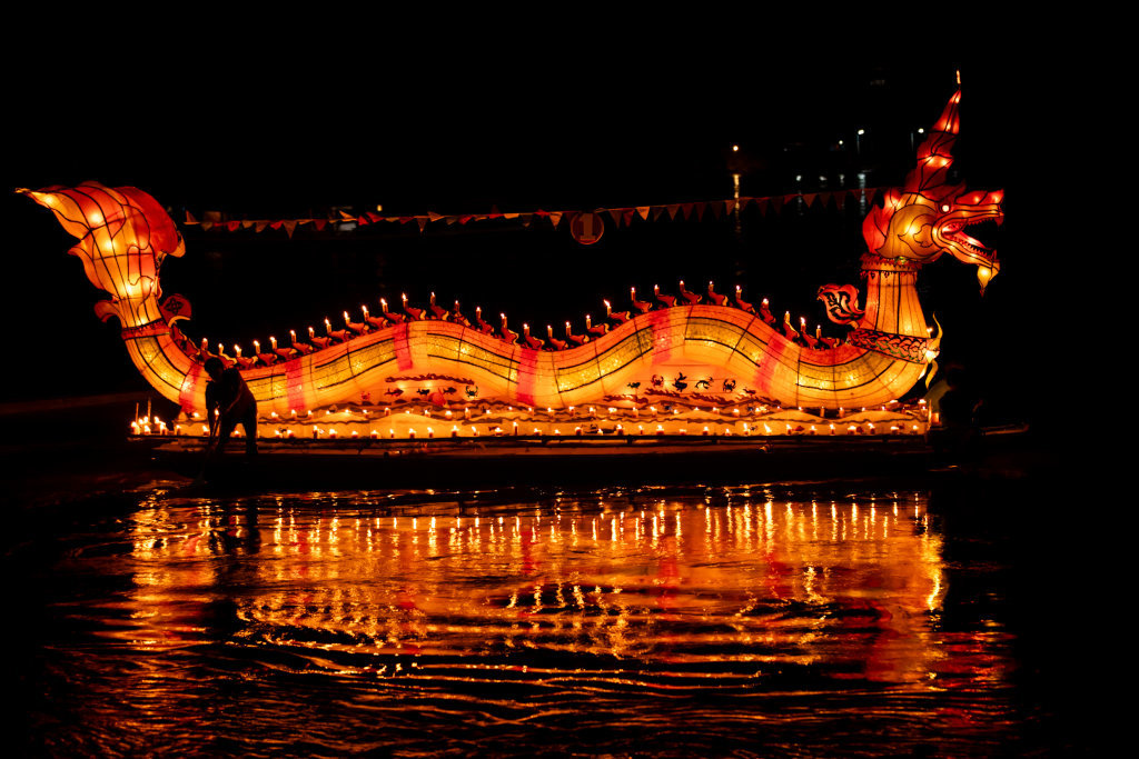 10月8日,老挝琅勃拉邦庆祝传统节日——灯船节。当晚,老挝琅勃拉邦的街头灯光闪烁,人们穿着传统服装参加灯船游行,将灯船放入湄公河中,祈求来年风调雨顺、幸福安康。