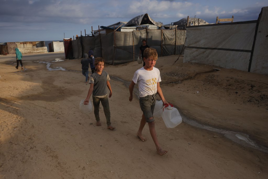 10月9日,在加沙地带中部扎韦达,流离失所的儿童前往一处物资分发点领取饮用水。