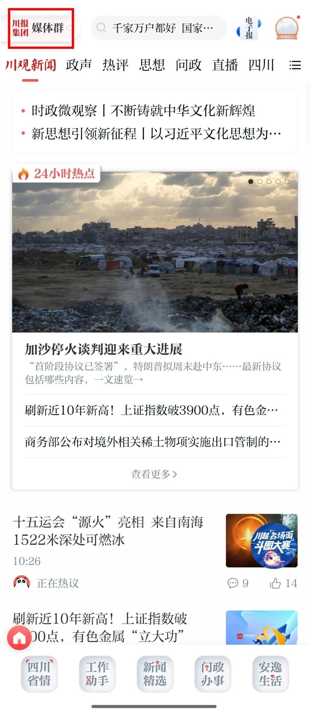 2、打开“川观新闻”App,点击左上角“川报集团媒体群”进行媒体切换。