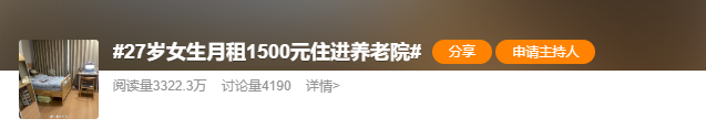 今天,话题“27岁女生月租1500元住进养老院”登上热搜。