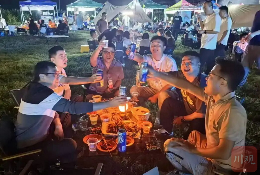 王岗坪乡铭恩广场首次开展为期6天的露营烧烤季活动。游客们围坐一圈享受自助烧烤,现场还有高校乐队驻唱、民族舞蹈演出等精彩节目。