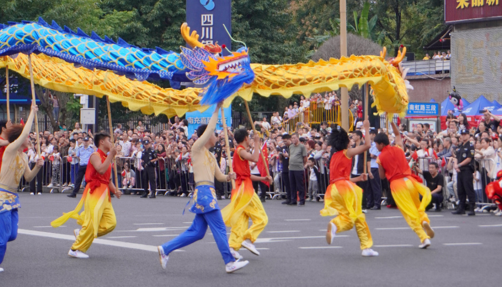 国庆文化巡演现场热闹非凡,演员们组成12个特色方阵,身着华美服饰扮靓街道,行进约3.5公里,以精彩表演展现南充文化与时代风采,现场欢呼声、掌声不断。