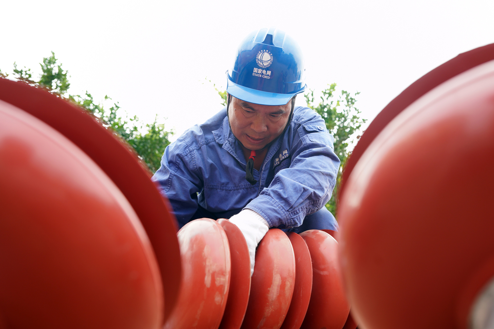 电力工人安装交流盘形悬式瓷复合绝缘子。(苟华彬 摄)