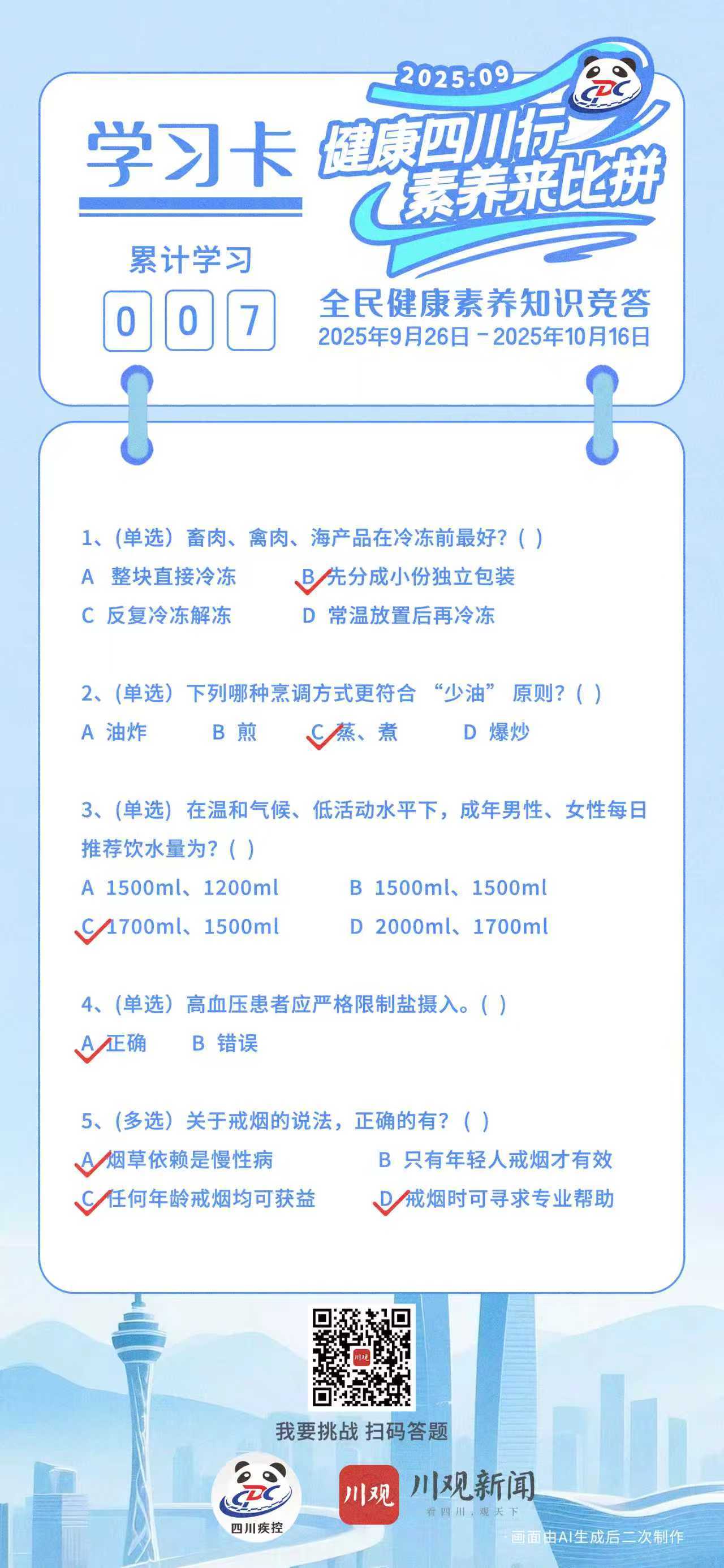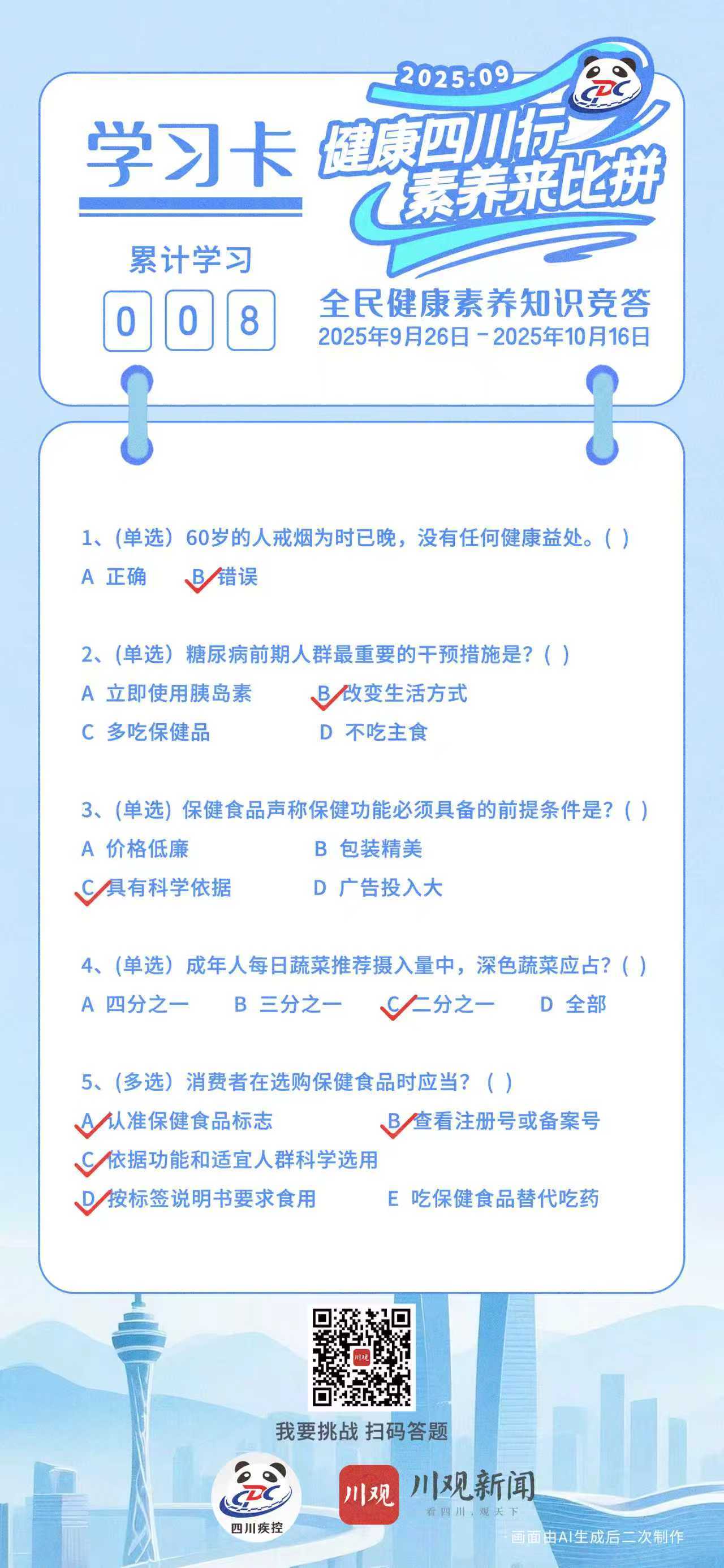 “健康四川行・素养来比拼——全民健康素养知识竞答”活动正火热开展,此次活动从9月26日开启,将持续至10月16日。活动开启后,全省群众参与热情持续高涨,积极投身知识竞答。10月10日,双学习卡正式上线,为选手向更高分数发起冲击提供支持。