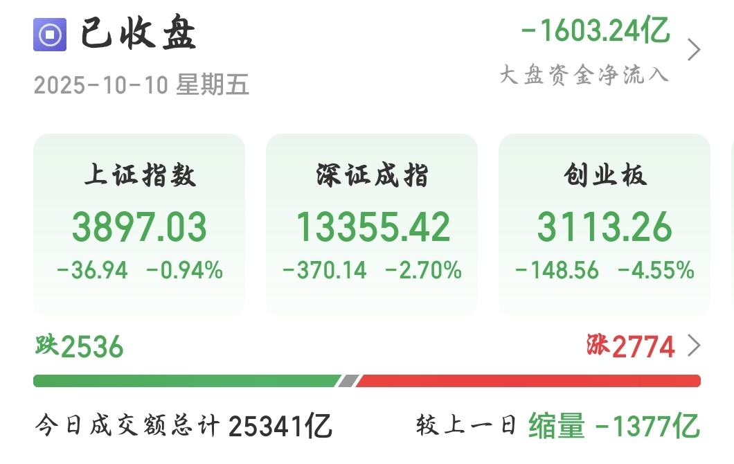 “刚站上3900点,就挨了当头一棒!”10月10日的A股盘面,让不少投资者心头一紧。三大指数当日集体飘绿,截至收盘,上证指数下跌0.94%,报收3897.03点;深证成指跌2.7%,报收13355.42点;创业板指跌幅4.55%,报收3113.26点。从资金面看,大盘主力资金净流出超1300亿元,半导体等前期热门板块遇挫。不过,若仔细拆解盘面细节,这轮调整更像是市场的“主动降温”。