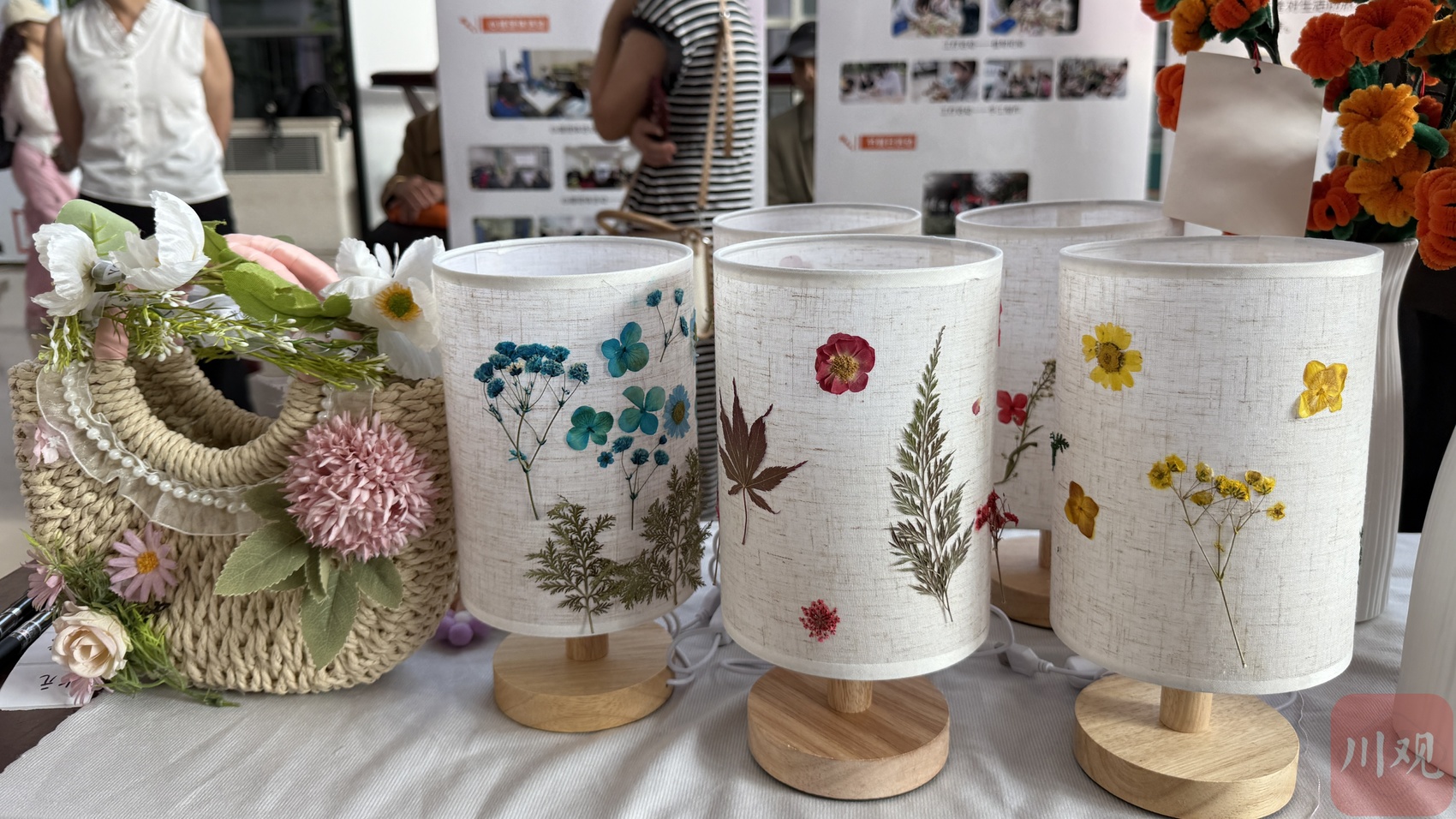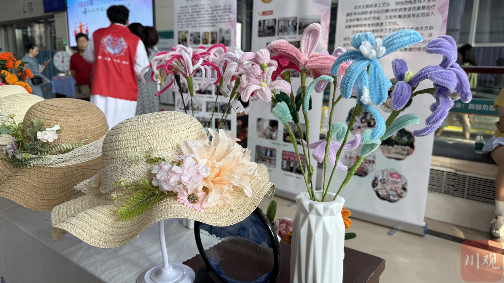 在门诊大厅右侧可以看到,桌上摆放了台灯、团扇等手工艺品,木质展架上放着精美的绘画。“这些手工艺品和绘画都是院内精神疾病患者在康复治疗活动中制作完成的。”西南医科大学附属医院心身医学中心副护士长何容芳说。